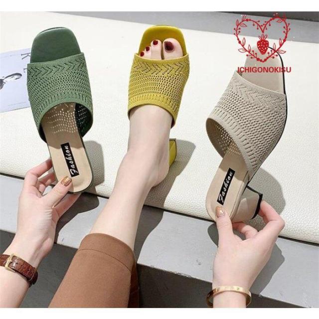 チャンキーヒールサンダル 美脚サンダル ニットサンダル ミュール レディース ミュール 痛くない 脱げない 美脚 疲れにくい オープントゥ ハイヒール