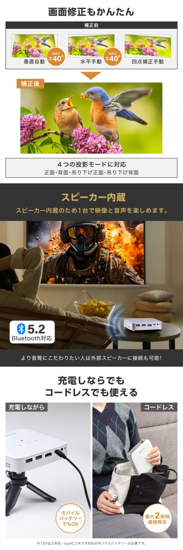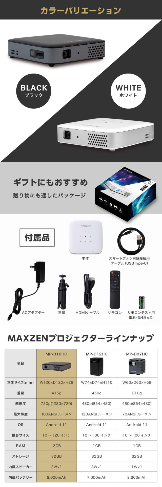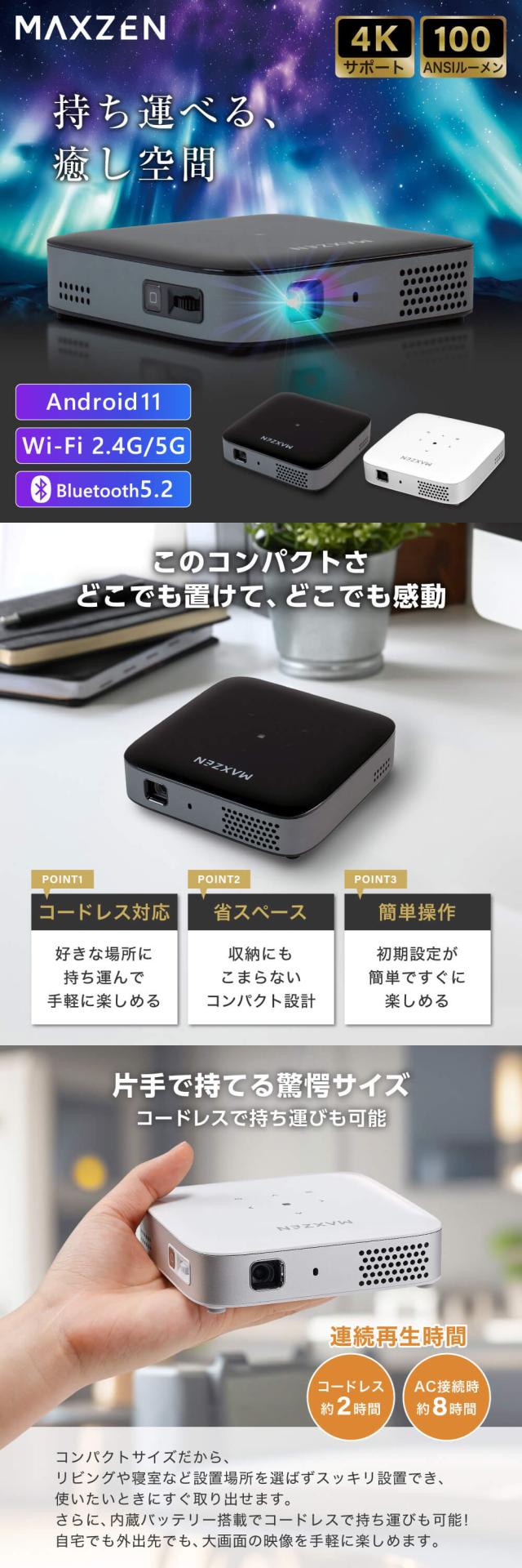 プロジェクター 家庭用 4K対応 ポータブル Wi-Fi2.4G/5G 8000mAh Youtube Netflix Hulu スマホ/PC/ゲーム機/DVD対応 Bluetooth5.2 Android11 自動台形補正 短距離投影 小型 コンパクト ミニ アウトドア キャンプ マクスゼン ブラック 黒 MP-D10HC