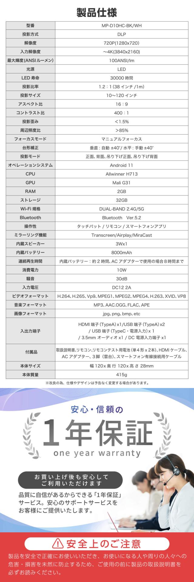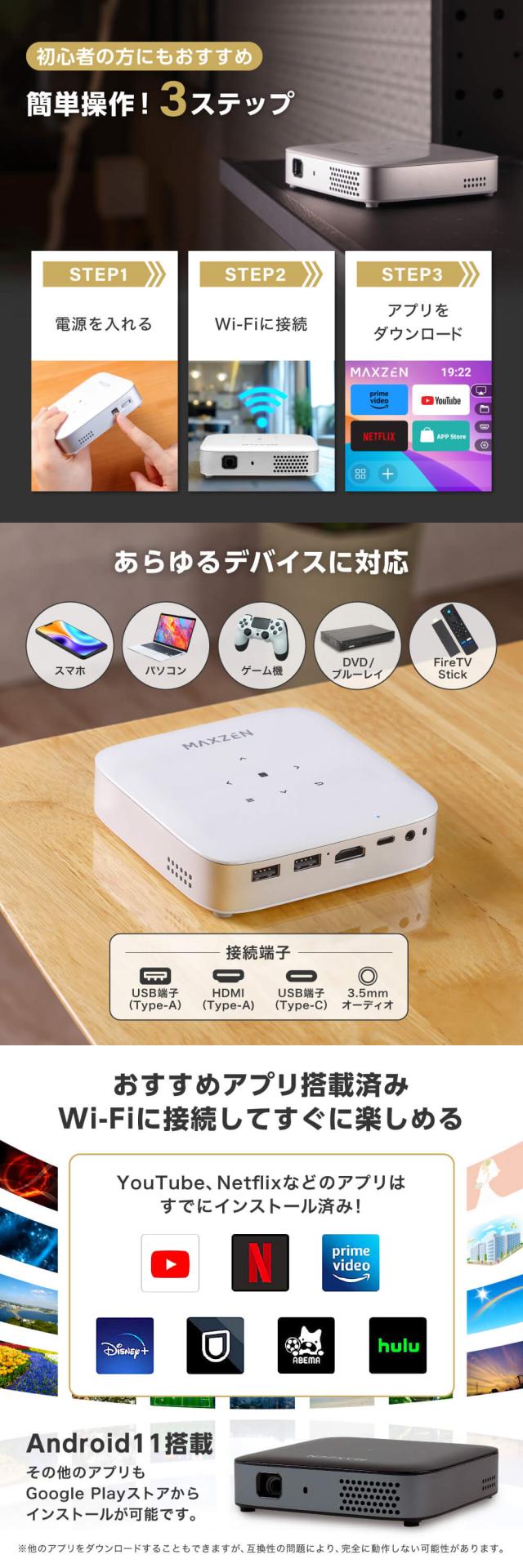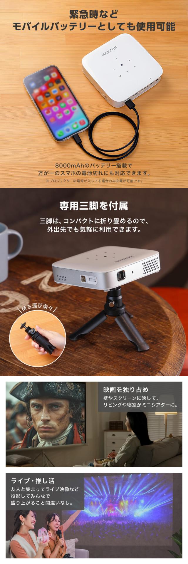 プロジェクター 家庭用 4K対応 ポータブル Wi-Fi2.4G/5G 8000mAh Youtube Netflix Hulu スマホ/PC/ゲーム機/DVD対応 Bluetooth5.2 Android11 自動台形補正 短距離投影 小型 コンパクト ミニ アウトドア キャンプ マクスゼン ブラック 黒 MP-D10HC