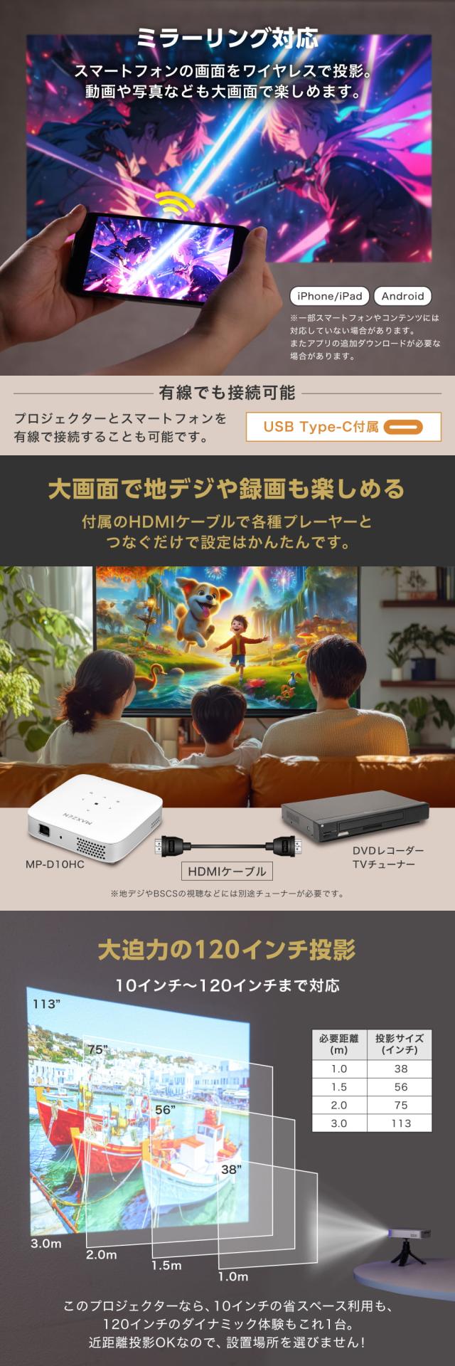* 投影サイズ: 10~120インチ