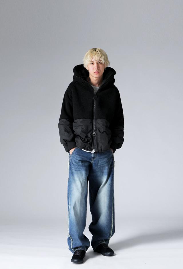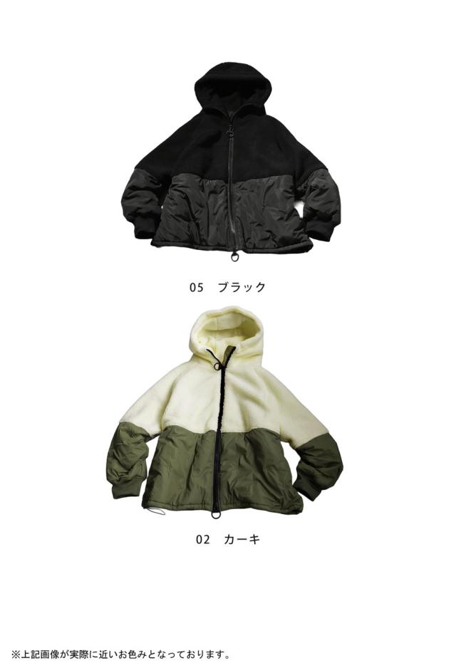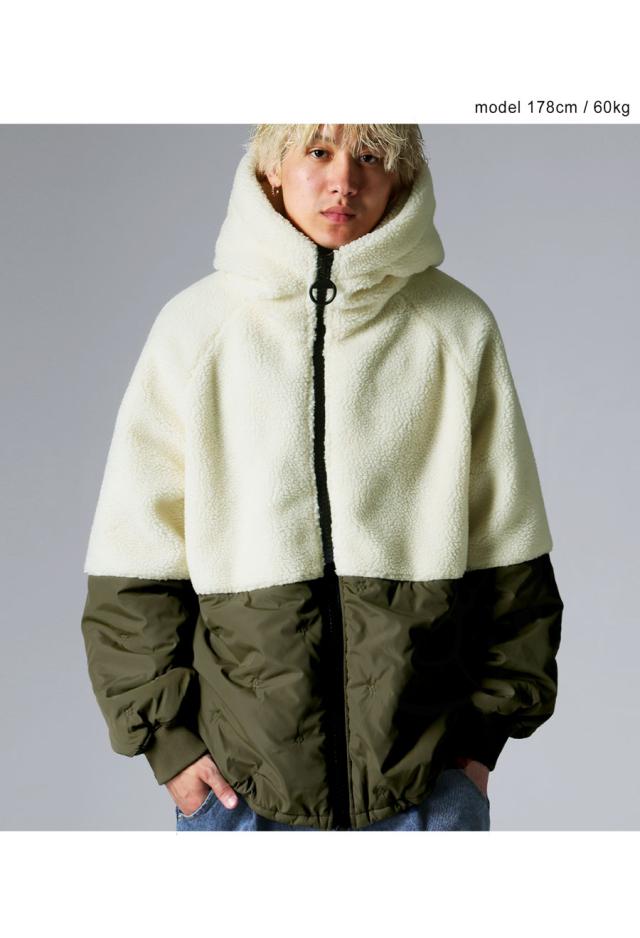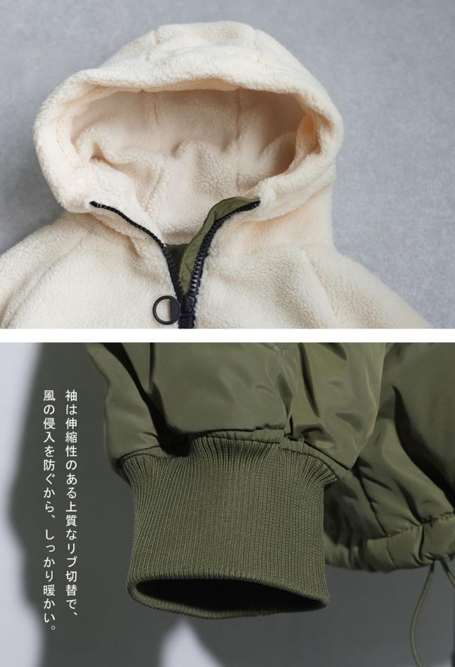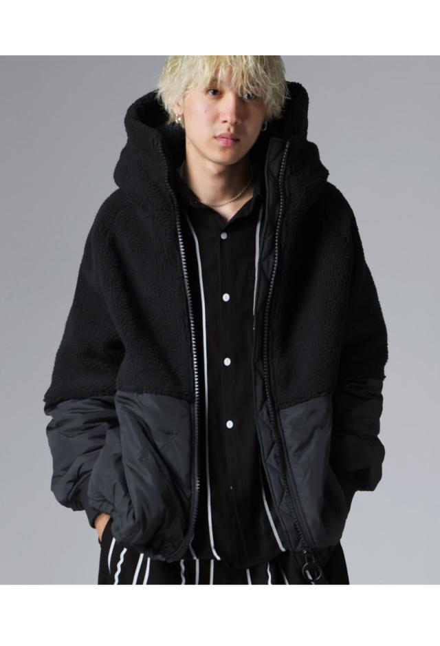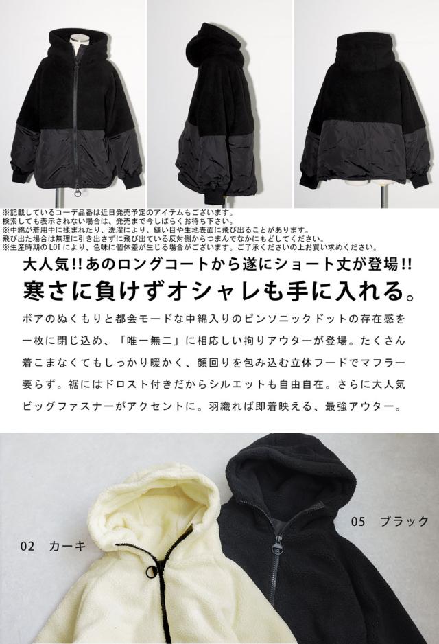 異素材の切り替えが目を惹くショート丈の中綿入りボアコートが登場。