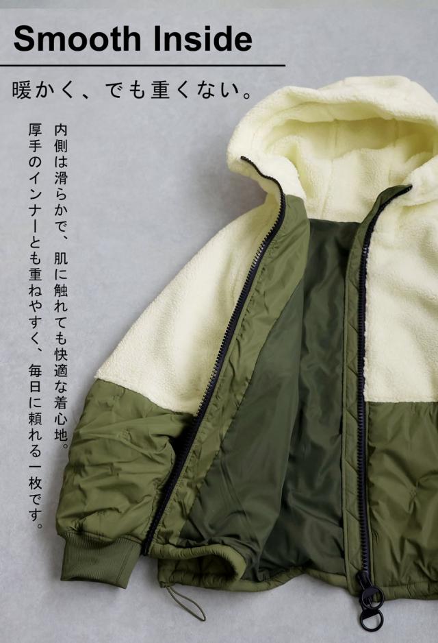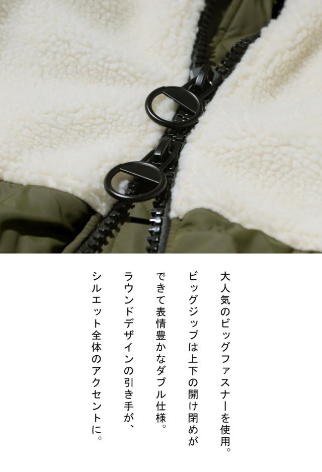 ネックラインまで覆うボア仕様の立体フードが顔まわりを暖かく包み、小顔効果も期待できます。