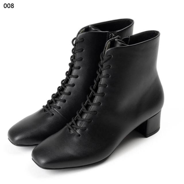 ・約4センチヒールのスクエアトゥのレースアップブーツ。