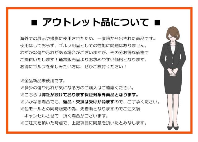 海外での展示や撮影に使用されたため、一度箱から出された商品です。使用はしておらず、ゴルフ用品としての機能に問題はありません。わずかな傷や汚れがある場合がございますが、その分お得な価格でご提供いたします。