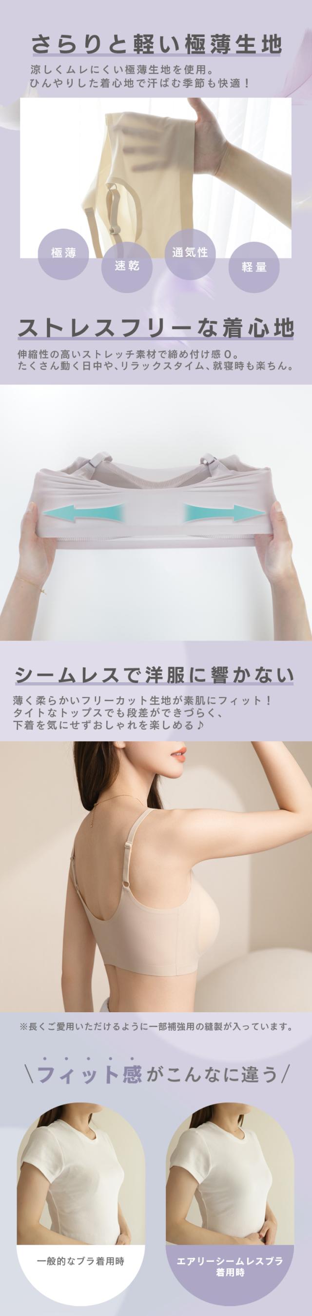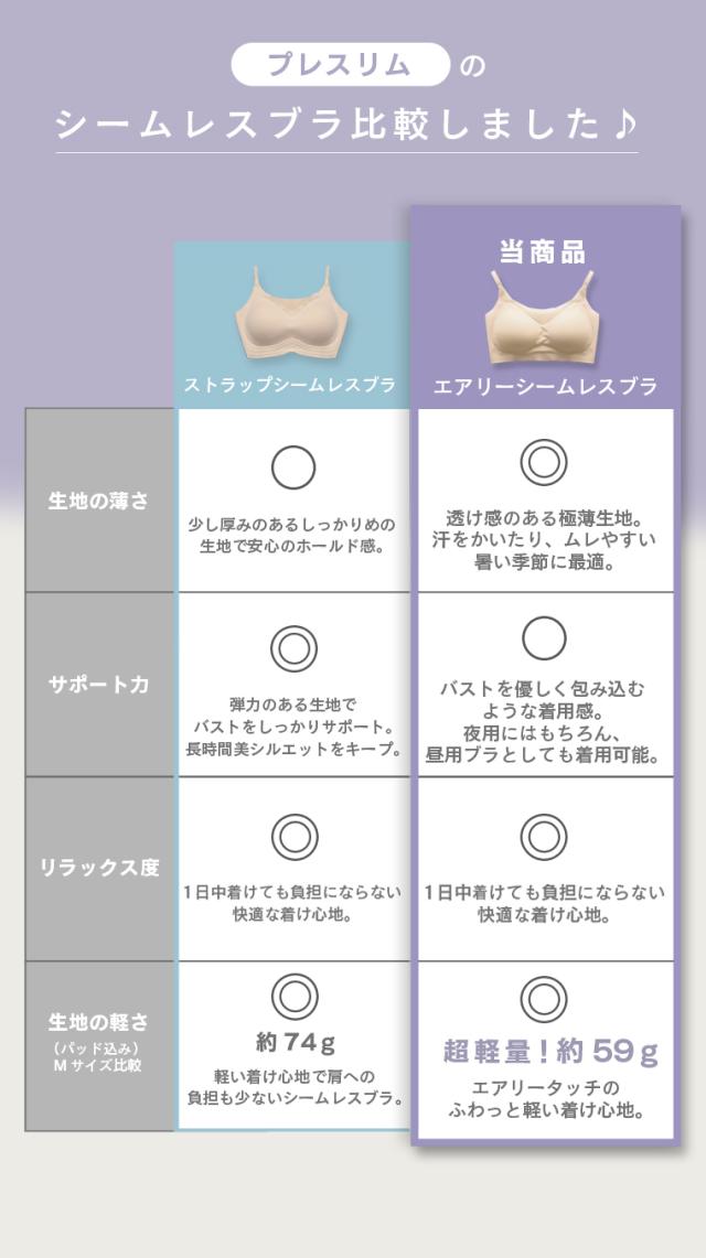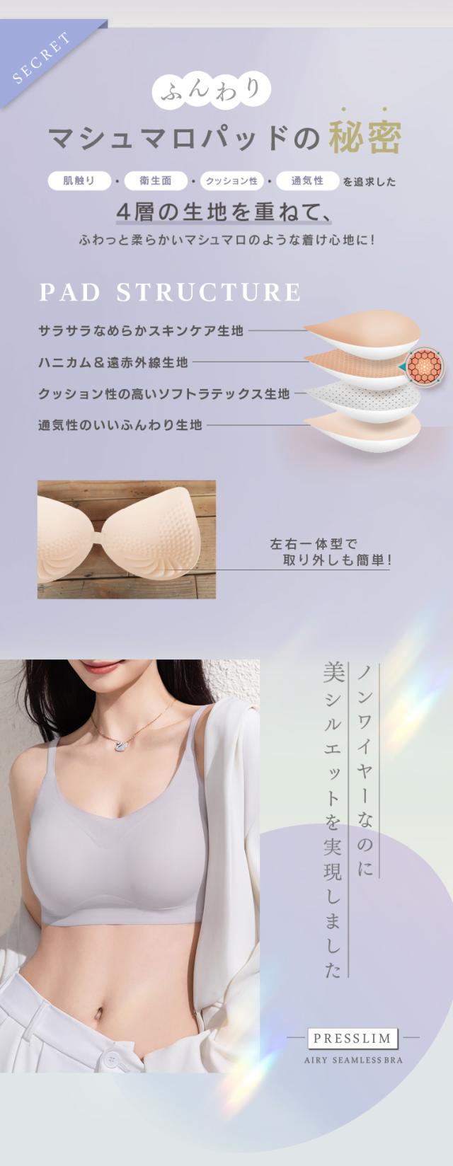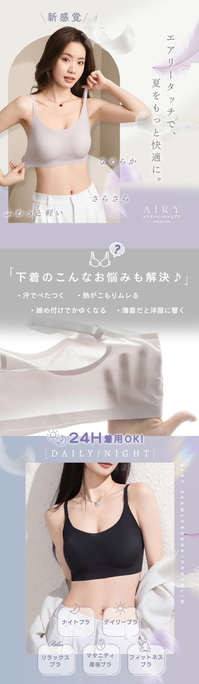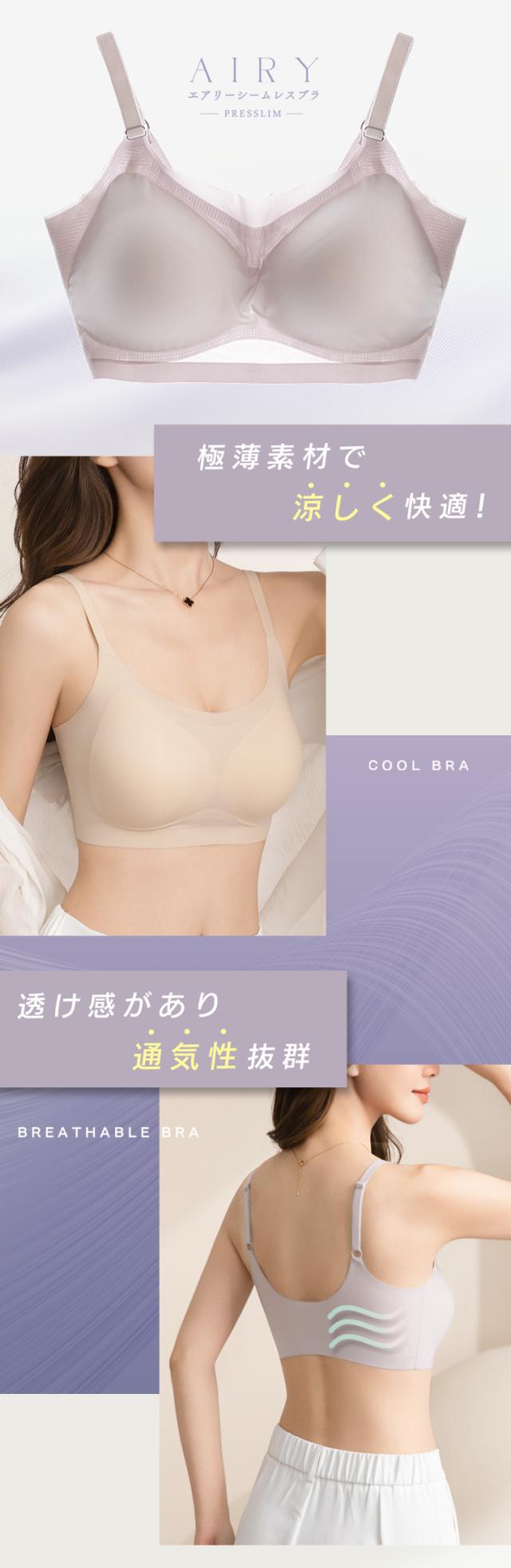 プレスリム エアリーシームレスブラ 極薄 ノンワイヤー ナイトブラ 涼しい ひんやり エアリータッチ シームレスブラ 夏用 蒸れない 速乾 軽量 薄い 締め付けない 24時間使える ブラジャー ストレスフリー リラックス 授乳ブラ マタニティーブラ 育乳 シンプル 痛くない 昼 夜