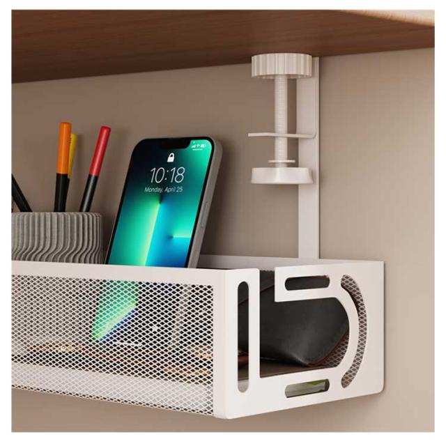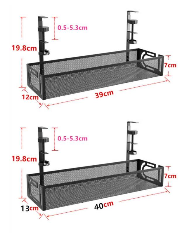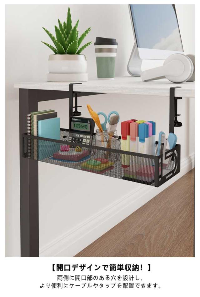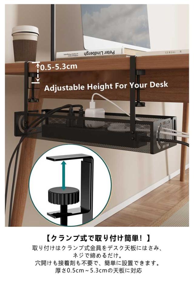 | ケーブルの混乱から解放! 穴あけ/接着剤不要 双方向取付可能 メッシュ型ケーブルトレー 2カラー×2サイズ <お勧めポイント> 【スペースを効率化!スッキリ収納】 デスク下のぐちゃぐちゃなケーブルや電源タップを効率的に収納。 足元や机上のスッキリとした空間を取り戻します。 【開口デザインで簡単収納!】 両側に開口部のある穴を設計し、より便利にケーブルやタップを配置できます。 【通気性と放熱性のよいデザイン!】 ホコリが溜まりにくいメッシュ設計。 優れた通気性で機器の過熱を軽減します。 【内外、双方向に取り付け可能!】 設置環境に合わせて、デスクから外向き又は内向きに設置、 デスクサイドに設置などお好みの場所に取り付けできます。 【クランプ式で取り付け簡単!】 取り付けはクランプ式金具をデスク天板にはさみ、ネジで締めるだけ。 穴開けも接着剤も不要で、簡単に設置できます。 厚さ0.5cm?5.3cmの天板に対応 【優れた耐久性とオシャレなデザイン!】 スチール(炭素鋼)製で丈夫なので、耐荷重約5kg前後まで安心です。 設置例:電源タップ、ケーブル、充電器、ルーターなど オシャレなデザインなのでオフィス、リビング、キッチンなどにも 設置可能デスク条件: (天板厚み)厚さ0.5cm?5.3cmの天板に対応しています。 (天板奥行)天板裏にパイプなどの骨組みや障害物がある場合、天板端から骨組みや障害物まで4.2cmのスペースが必要です。 (天板形)コの字型(通常の天板)で使用できます。天板の裏が傾斜しているような特殊な形では設置できません。 ケーブルトレー組み立て方: 1.組み立てる前にクランプ式金具の締め付け幅を、取り付ける天板の幅とある程度合わせておくと取り付けが楽です。 2.クランプ式金具と収納かごのネジ穴を合わせる。この時に金具の向きでテーブルから外向きか内向きか決めます。 3.ネジを入れ、付属のレンチで締めて固定します。 4.テーブルに装着し、つまみネジを締めてテーブルに固定します。 | |