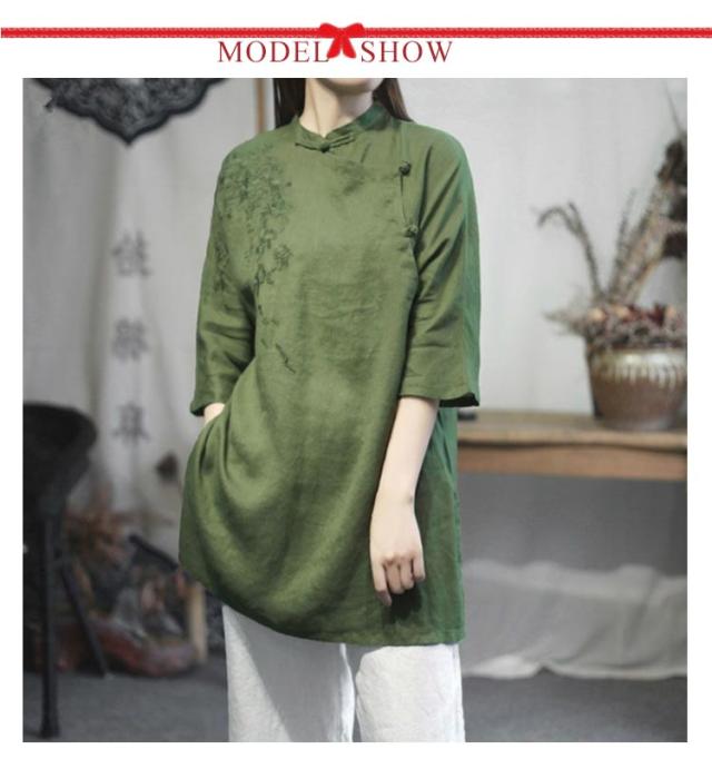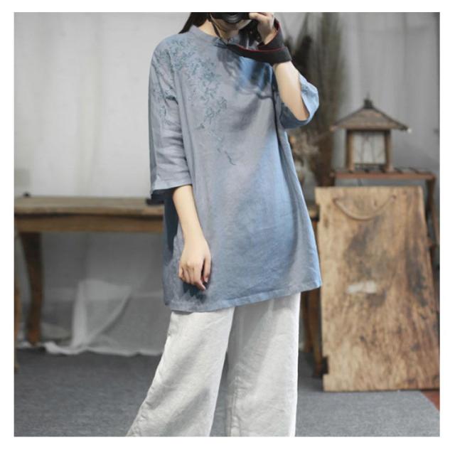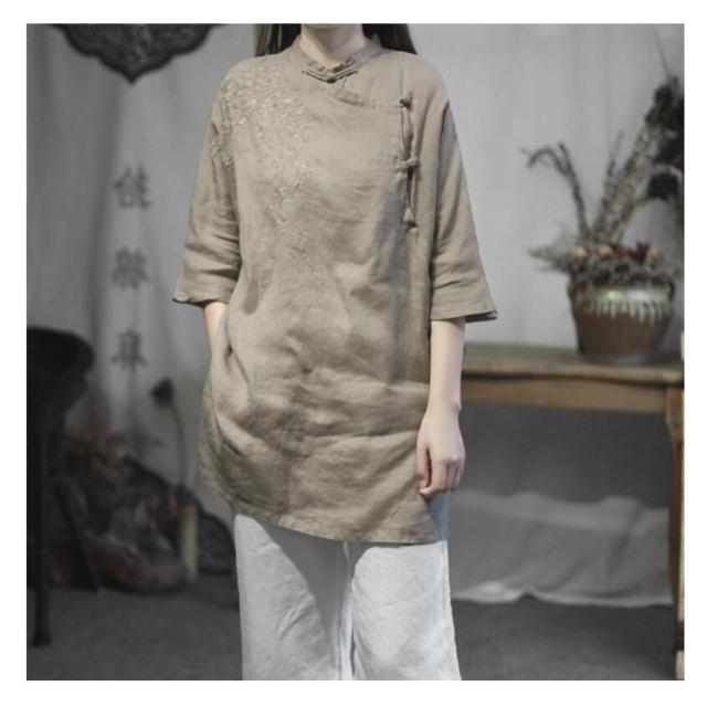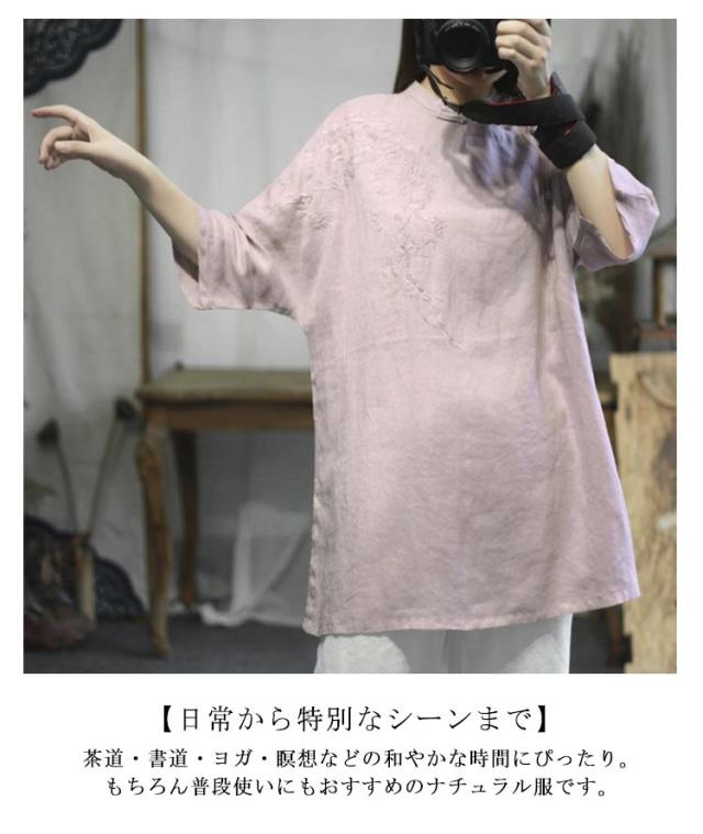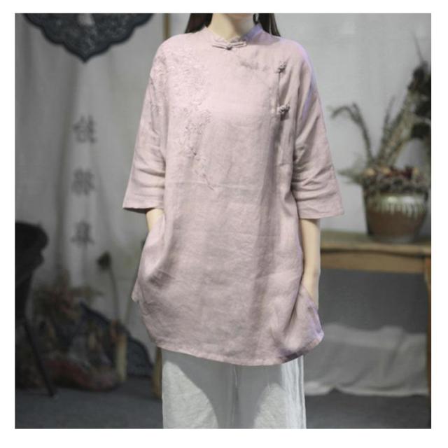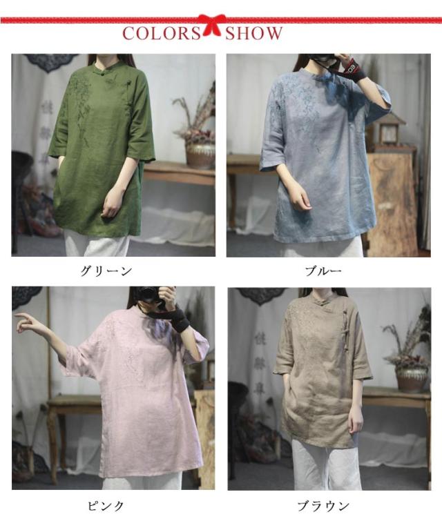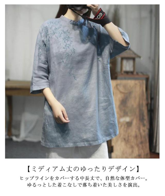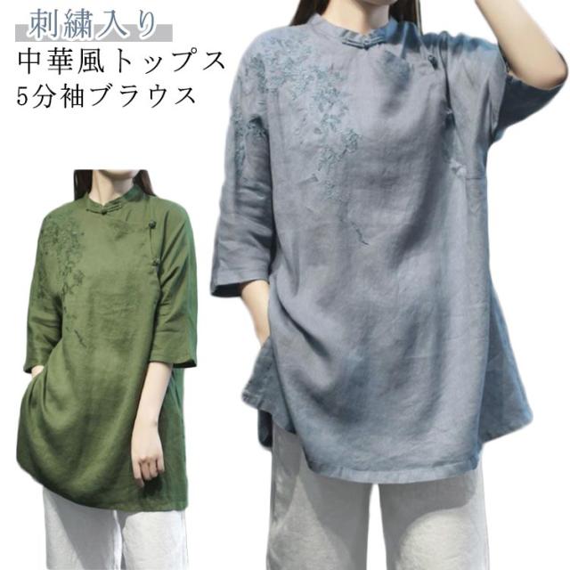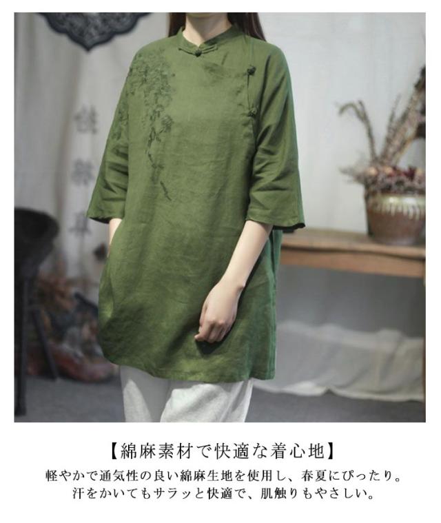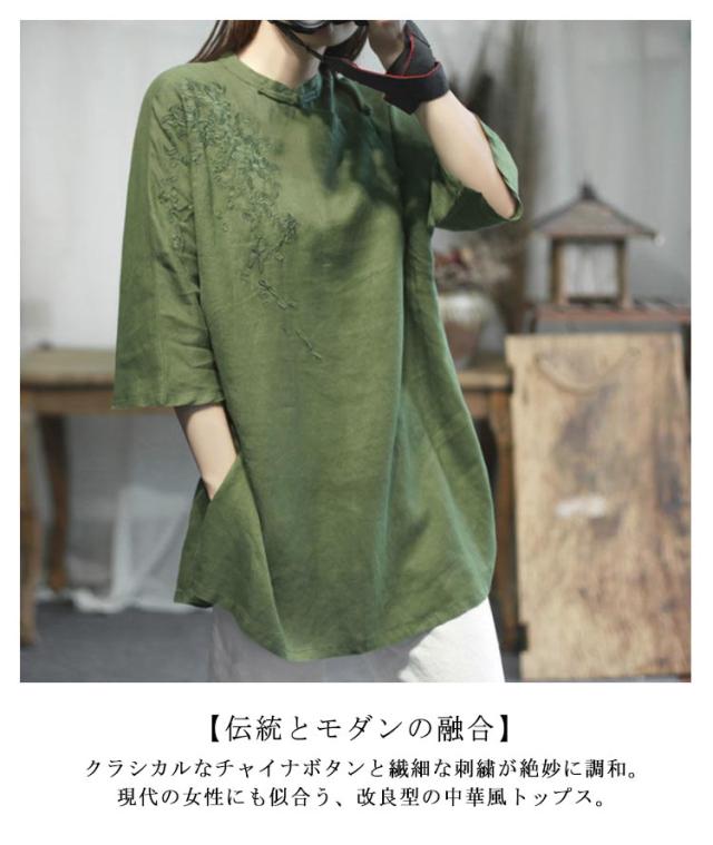 チャイナシャツ 刺繍入り 綿麻トップス トップス 中華風 夏服 チュニック 五分袖 刺繍ブラウス 大きサイズ ゆったり ナチュラル 体型カバー