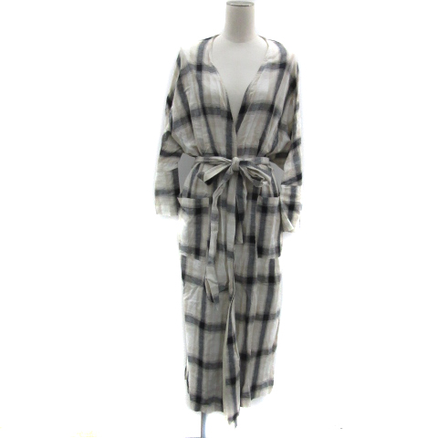 【中古】KBF アーバンリサーチ カーディガン 前開き チェック柄 リボンベルト付き 麻 リネン混 One 紺 レディース