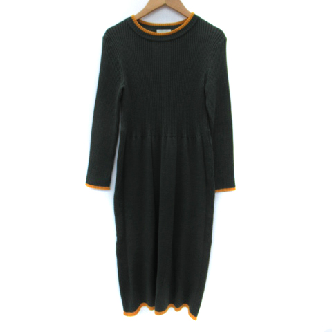 【中古】アンレクレ en recre ニットワンピース ミモレ丈 長袖 リブ 9 モスグリーン マスタードイエロー