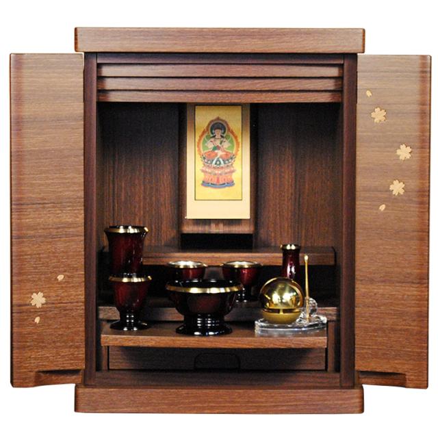 仏具付き・ミニモダン仏壇【桜都(おと)桜柄木象嵌 15号 ウォルナット色】 小型仏壇 家具調仏壇 送料無料