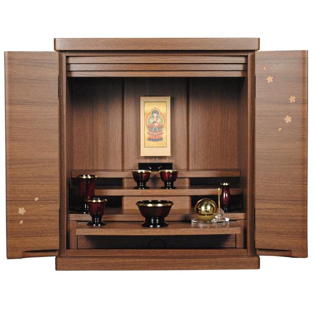 仏具付き・ミニモダン仏壇【桜都(おと)桜柄木象嵌 19号ワイド ウォルナット色】 小型仏壇 家具調仏壇 送料無料