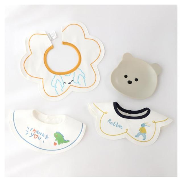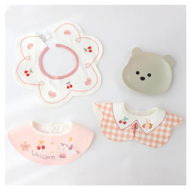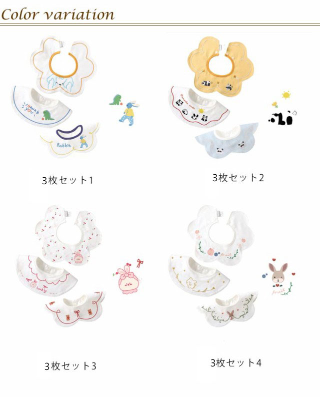 | まあるい花形が可愛い! 360度防水スタイ4枚セット ・回ってしまいがちなスタイでも360度タイプでちゃんとよだれをキャッチ。 ・綿100%で柔らかく、優しくて安心な肌触り。 ・中に防水シートが入っているので、吸収性と防水性が抜群の3層構造。 ・花形の可愛いデザインなのでシンプルなコーディネートでもこれ一枚で華やかに決まります。 ・出産祝いのプレゼントに最適です★ | |
