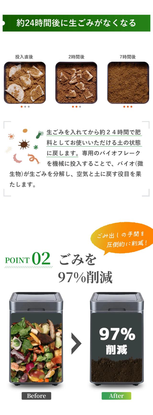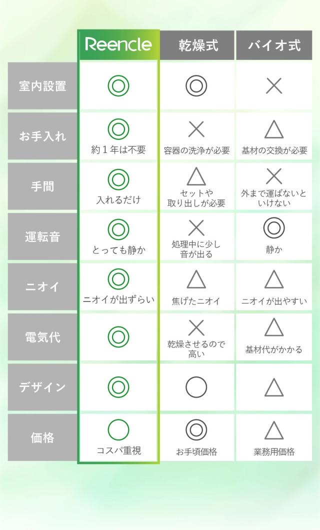 熱を加えて乾燥処理を行う乾燥式に比べ、熱とバイオの力で処理を行うため家計にも優しい省エネ仕様に設計されています。