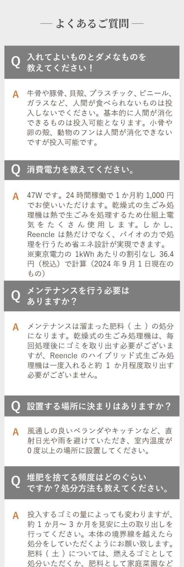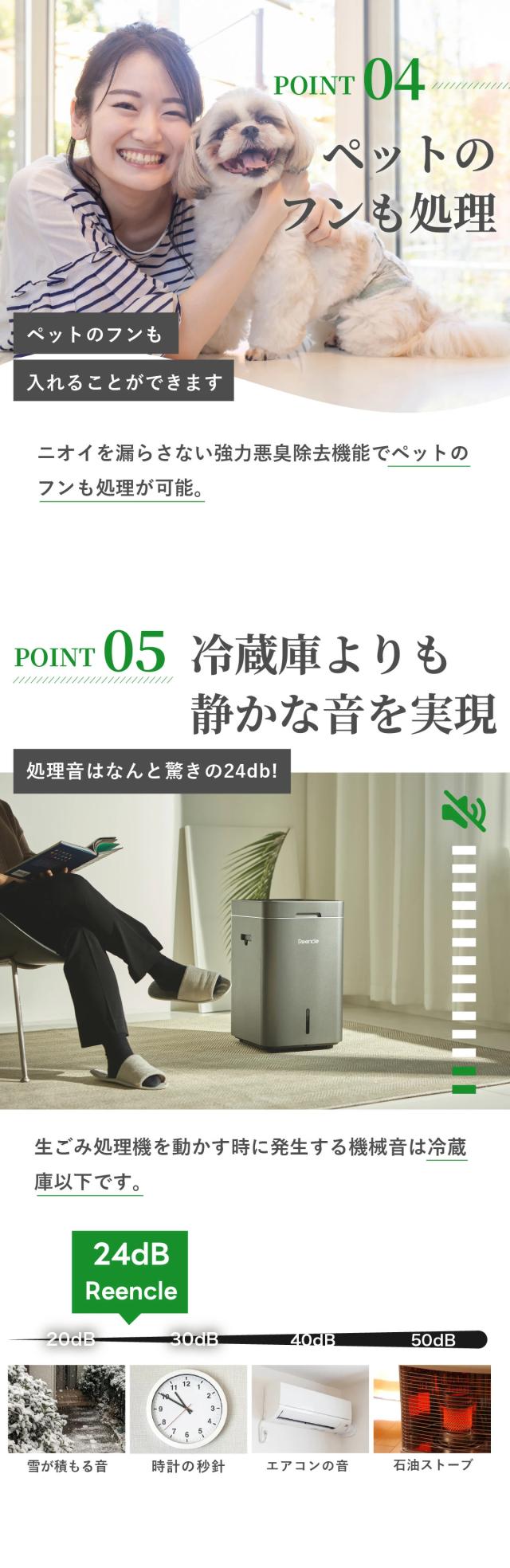 しかし、Reencleの生ごみ処理機はハイブリッド式で内部の撹拌が ゆっくりと回転しバイオの力で処理を行うため、処理音を最小限に抑えることができます。