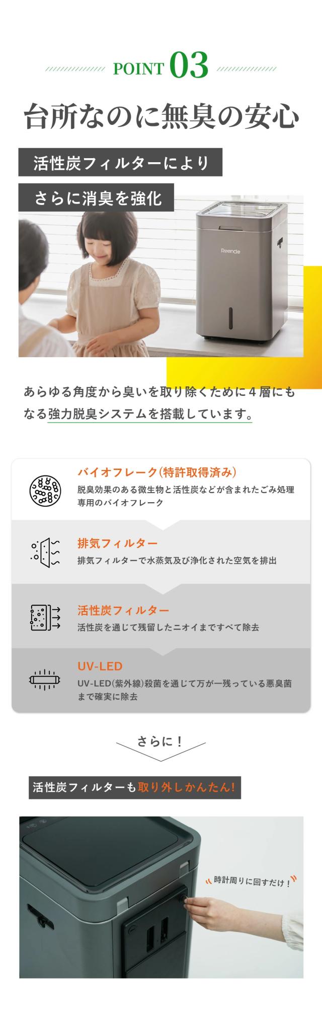 Reencleの生ごみ処理機は4層もの消臭システムを採用し、脱臭効果の専用バイオ フレーク、高濃度イオン酸化触媒(TiO2)搭載の排気フィルター、活性炭フィルター、 UV-LED脱臭装置によるニオイ除去の順番で徹底的に匂いを取り除きます。