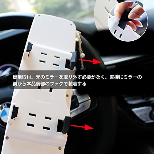【便利】:簡単取付、元のミラーを取り外す必要がなく、直接にルームミラーの前から本品後部のフックで装着するだけでご使用して頂けます。画像の矢印の方向でフックを固定します。