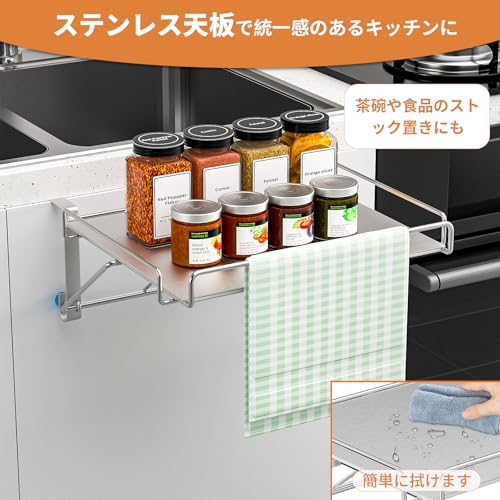 調理スペース奥やコンロ横に。棚板は傷が極めて目立ちにくスーパーエンボス加工のステンレスなので永くご使用いただけます。(簡易組み立て)