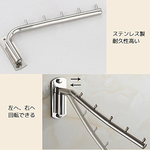 フックは回転式なので、好きな方向に自由に調節可、フックは必要に応じて開け閉めでき、場所取らずに楽々収納できる。ボルトで簡単に取り付ける。
