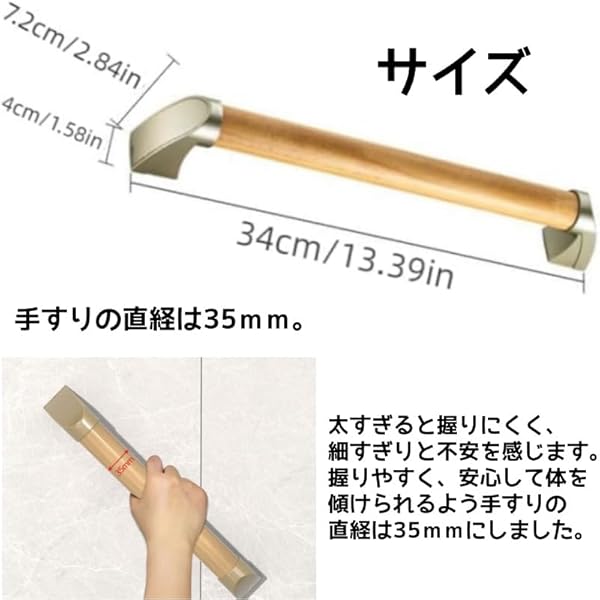 【浴室 手すり 34/44cm優れった素材】自然木を使用したぬくもりある上質な握り心地です。すべりにくいディンプル加工で、観た目はシッカリ、握るとシックリ。 安全援助の理想的な保健指導補助具です。