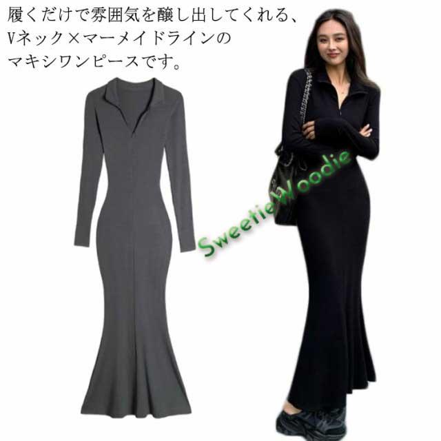 マーメイド ワンピース マーメイドライン ロングワンピース Vネック マキシワンピース マーメイドワンピース ハーフジップ 折り襟 長袖 タイトワンピース 着?せ フェミニン きれいめ S M L XL 2XL