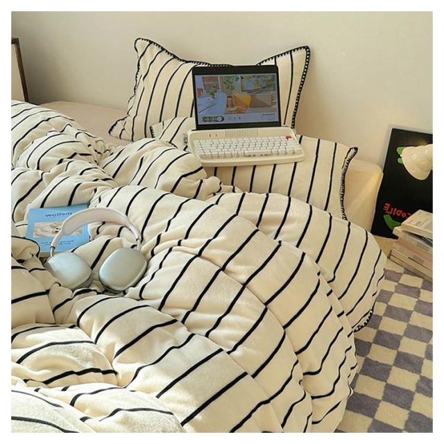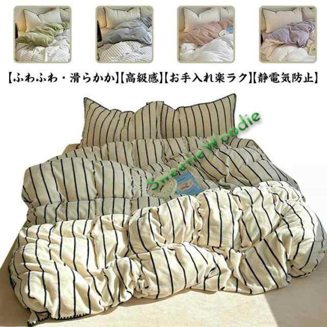 秋冬 あったか 布団カバーセット 4点セット ダブル クイーン ストライプ柄 ふわふわ 静電気防止 フランネル 掛け布団カバー ボックスシーツ/フラットシーツ 枕カバー 寝具カバーセット 北欧 防寒対策 洗える 掛けふとんカバー 敷布団カバー 枕カバー ベッドカバー