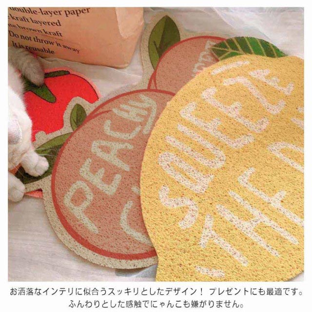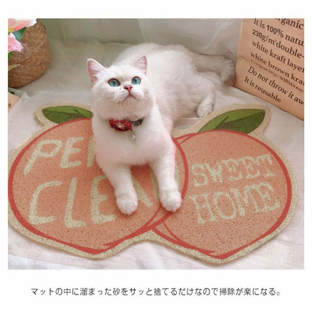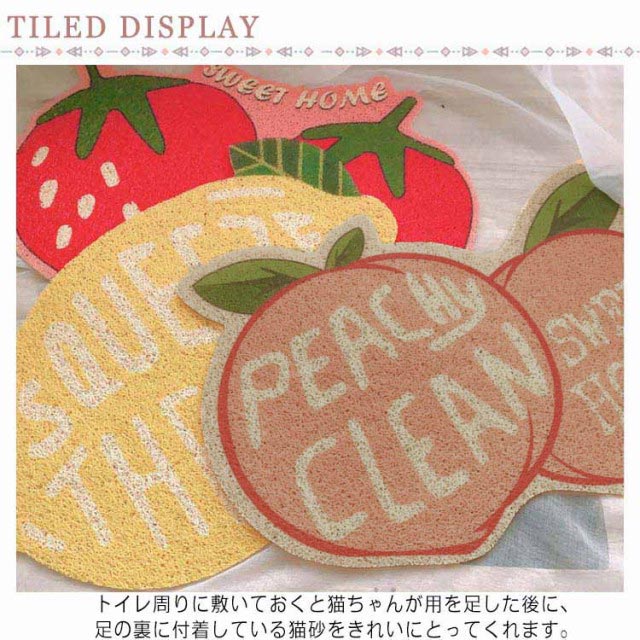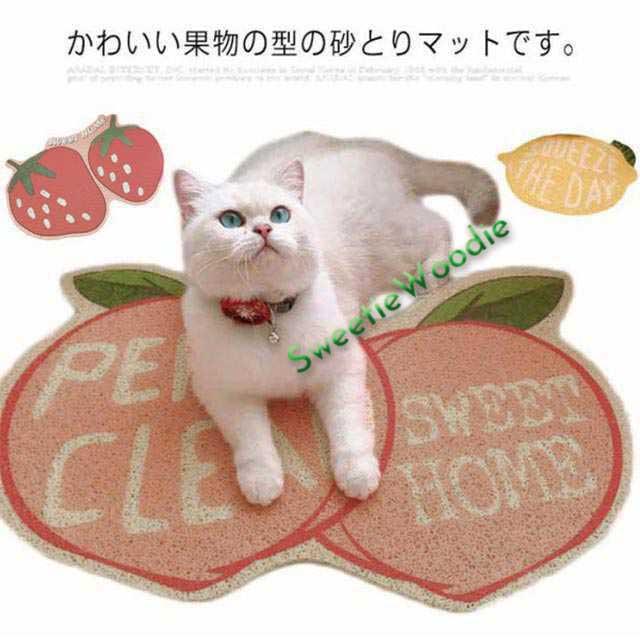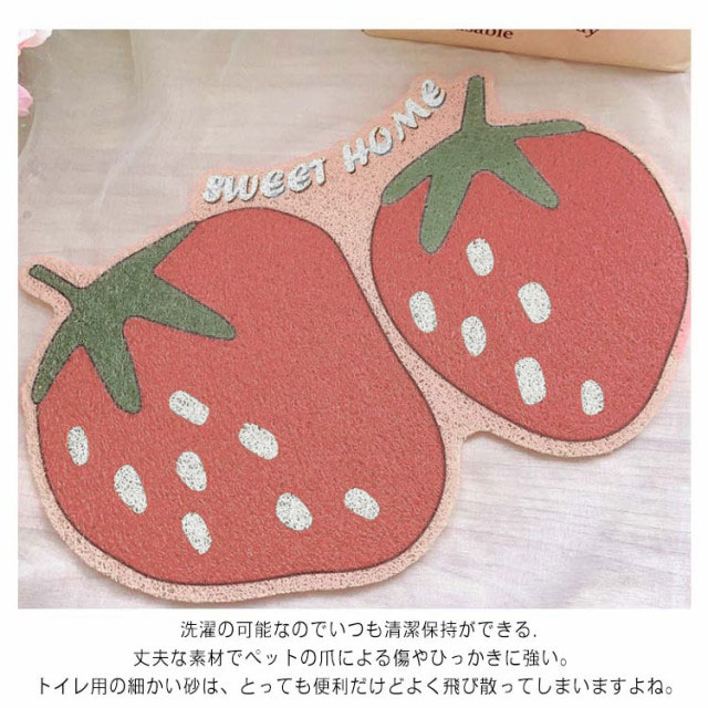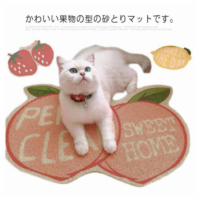 | かわいい果物の型の砂とりマットです。 トイレ周りに敷いておくと猫ちゃんが用を足した後に、足の裏に付着している猫砂をきれいにとってくれます。 ふんわりとした感触でにゃんこも嫌がりません。 トイレ用の細かい砂は、とっても便利だけどよく飛び散ってしまいますよね。 トイレの出入り口にセットすれば、トイレ周りの砂の飛び散りも安心です。 | |