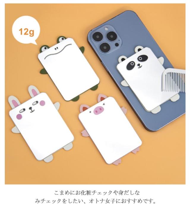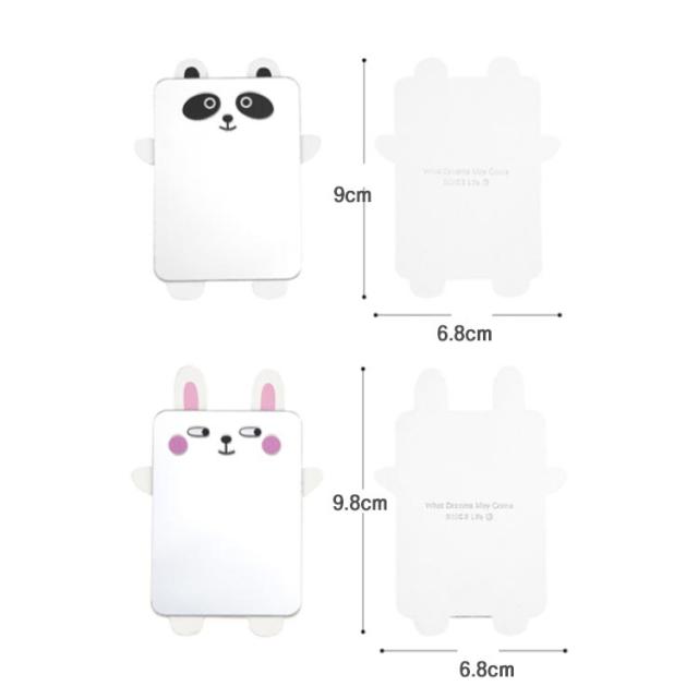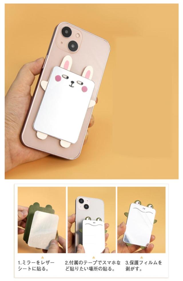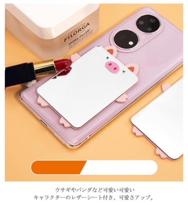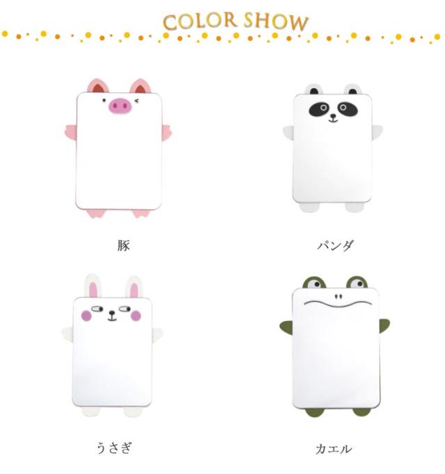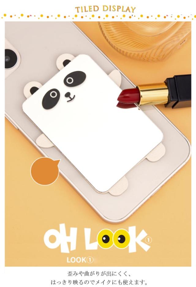 | スマホケースや手帳などに貼り付けたり、そのままポーチやバッグに入れたりお使いできる割れないミラー。 歪みや曲がりが出にくく、はっきり映るのでメイクにも使えます。 こまめにお化粧チェックや身だしなみチェックをしたい、オトナ女子におすすめです。 ウサギやパンダなど可愛い可愛いキャラクターのレザーシート付き、可愛さアップ。 | |