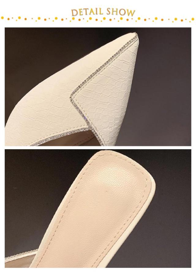 | Vカットポインテッド×ラインストーンで華奢な印象に。 ミュールタイプだから堅すぎず足元に抜け感をプラス。 低反発インソールで歩くとき体重のかかる部分をサポートしてくれる。 アウトソールはグリップ力に優れた合成ゴム素材を使用し、滑りにくく安心して歩けます。 キラキララインストーンと女性らしいシルエット、お呼ばれや女子会など時も活躍。 | |