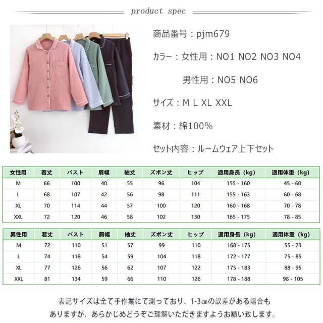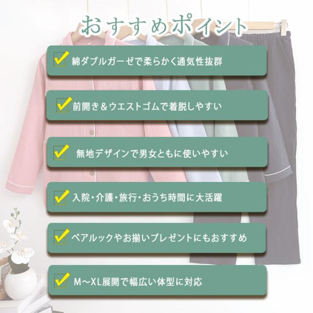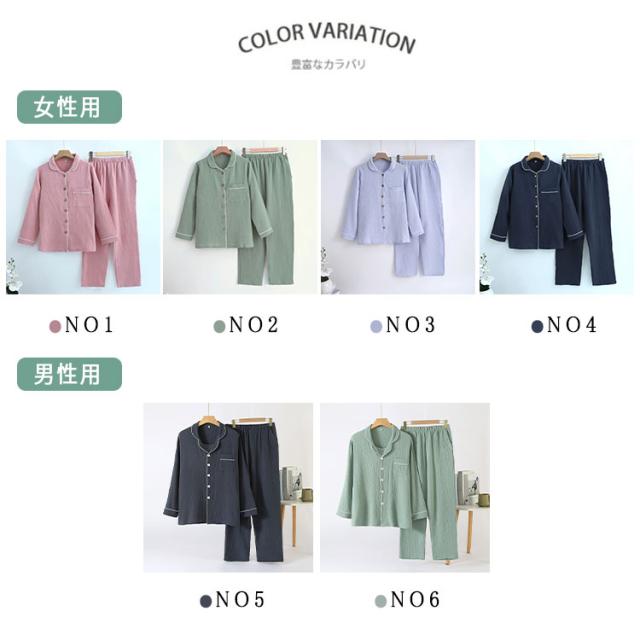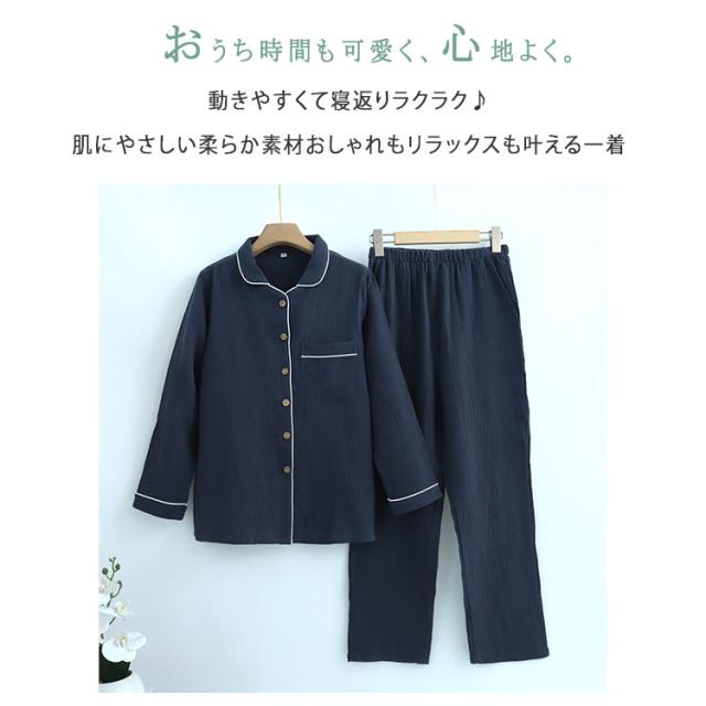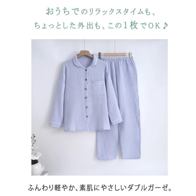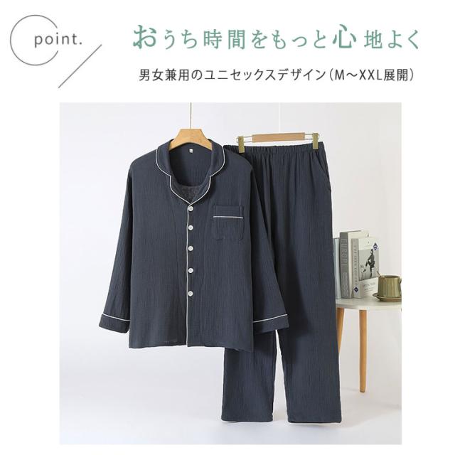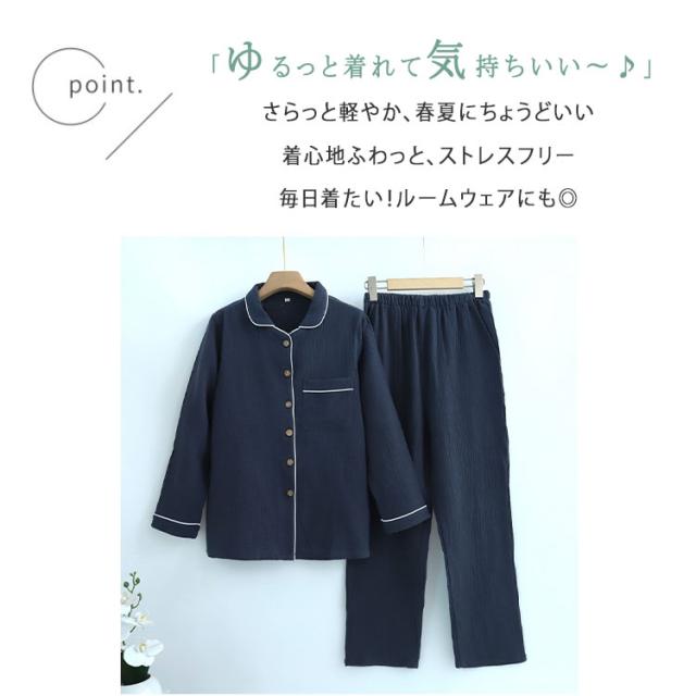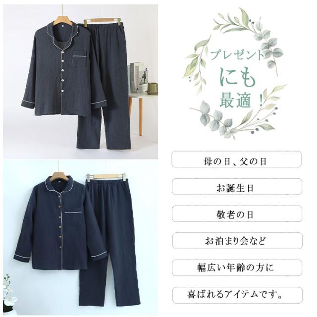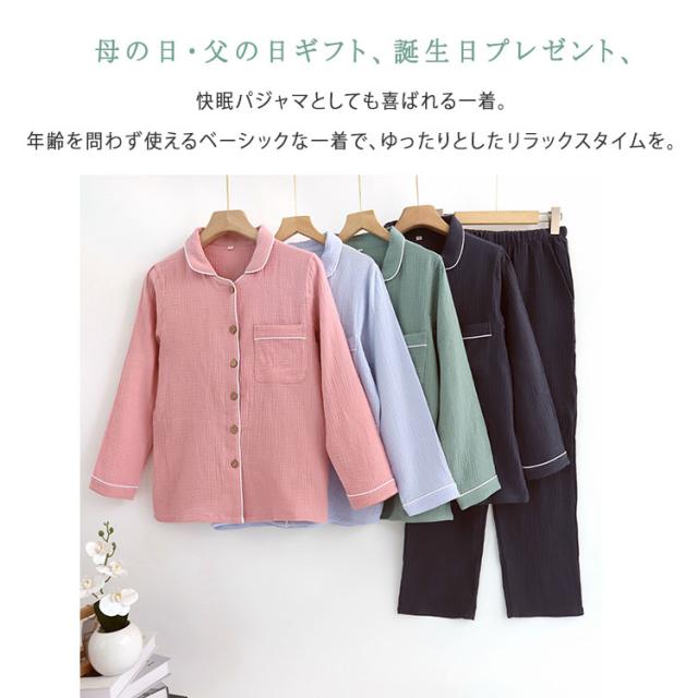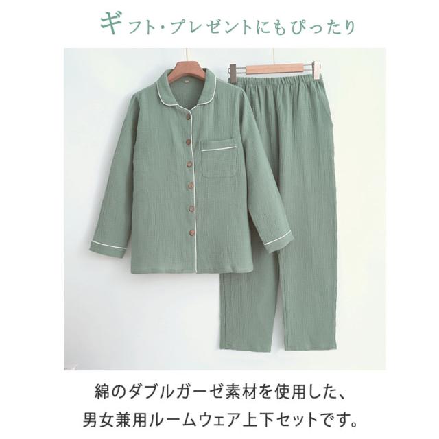 商品名 | ルームウェア パジャマ レディース メンズ 上下セット 綿 ダブルガーゼ 長袖 ロングパンツ 前開き 薄手 吸汗速乾 春 夏 秋 入院パジャマ 無地 部屋着 ナイトウェア 寝巻き ふんわり 快適 母の日 父の日 ギフト |