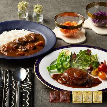 ビーフに数種の野菜(国産玉ねぎ、にんじん、じゃがいも、揚げ茄子)を加え、チャツネを隠し味に加えた味わい深いホテル監修カレーと、コク・うま味・程よい酸味が調和されたデミグラスソースが特徴のハンバーグとのセットです。