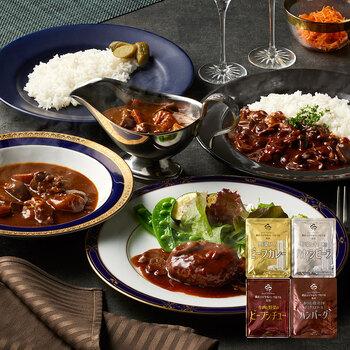 横浜ロイヤルパークホテル監修のカレー、ハヤシビーフ、ビーフシチュー、デミグラスソースハンバーグの4種類を味わえるセットです。