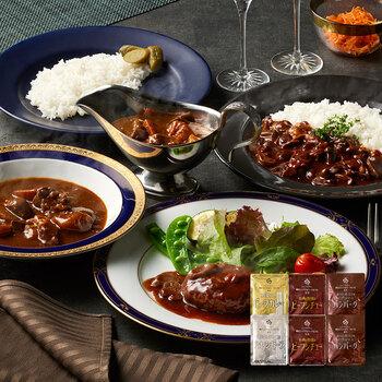 横浜ロイヤルパークホテル監修のカレー、ハヤシビーフ、ビーフシチュー、デミグラスソースハンバーグの4種類を味わえるセットです。