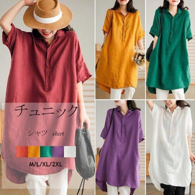 チュニック シャツワンピース シャツブラウス シャツワンピ ブラウス ロングシャツ ロング丈 シャツ ポケット付け 5分袖 トップス 綿麻 ゆったり 体型カバー