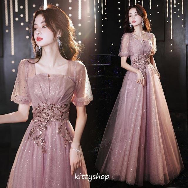 イブニングドレス パーティードレス ロングドレス 発表会ドレス パフスリーブ Aライン ロング丈 二次会ドレス お呼ばれドレス 結婚式ドレス