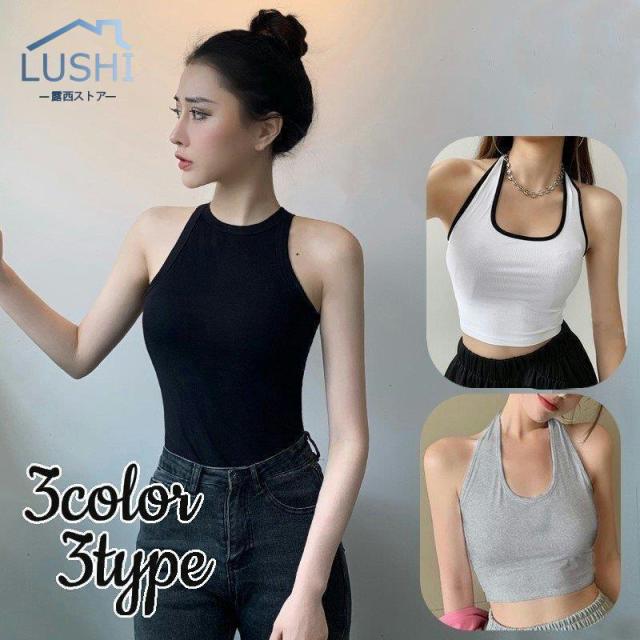タンクトップ レディース 婦人服 トップス アメリカンスリーブ ホルターネック ノースリーブ ラウンドネック ショート丈 タイト スリムフィット 無地