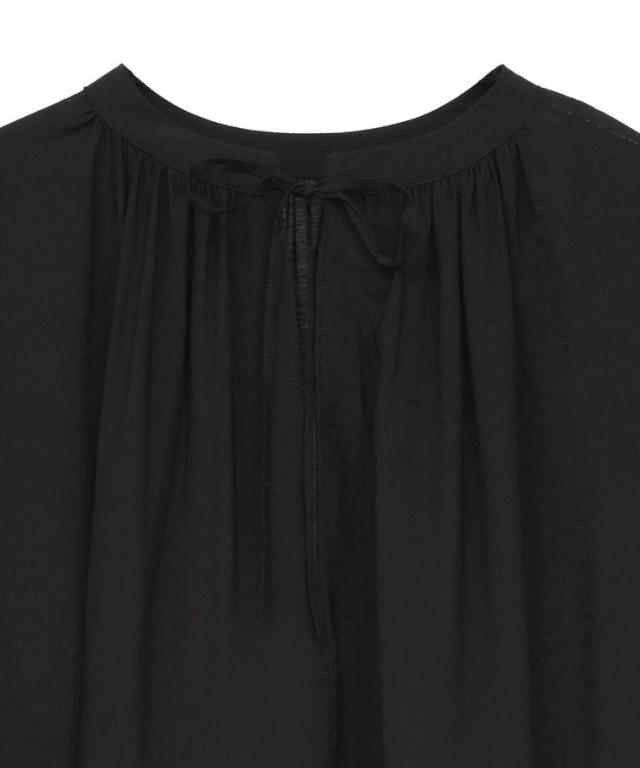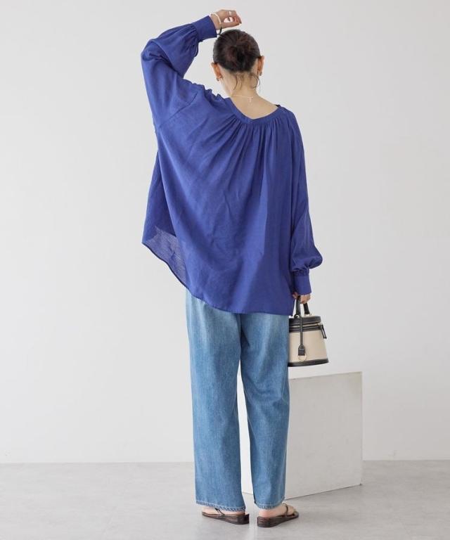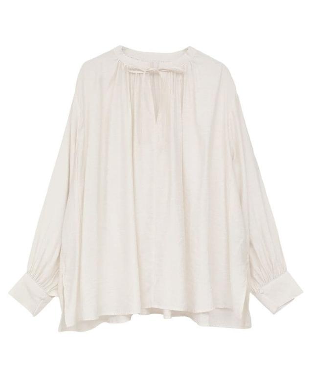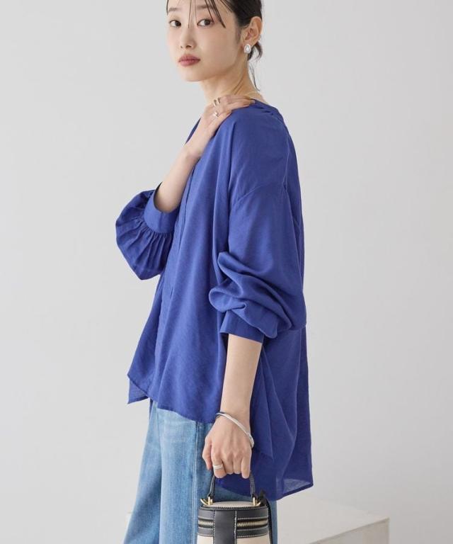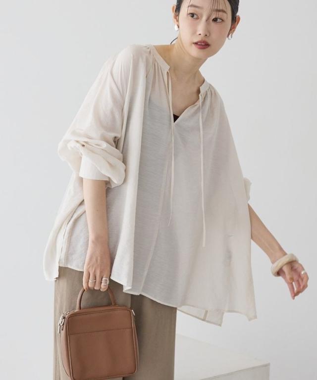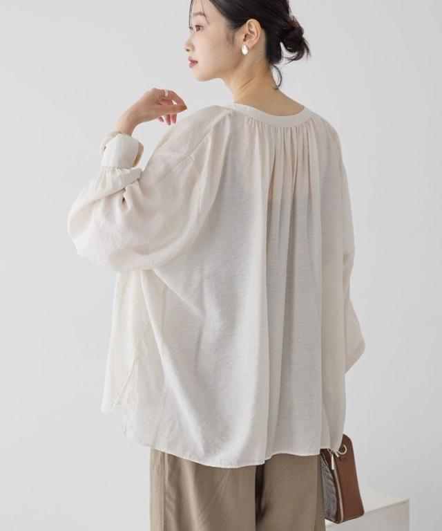 スタイリングに女性らしい抜け感を演出するスキッパーブラウス。シンプルながらも衿元のギャザーや紐など細かなデザインにこだわりました。さらりと爽やかな素材で着心地良く、暑い夏シーズンも涼し気。やや長めの着丈で体型カバーも叶う、今季おすすめのアイテムです。透け感[ややあり]