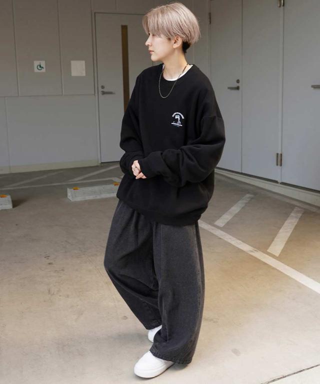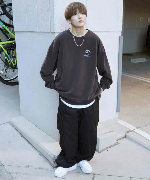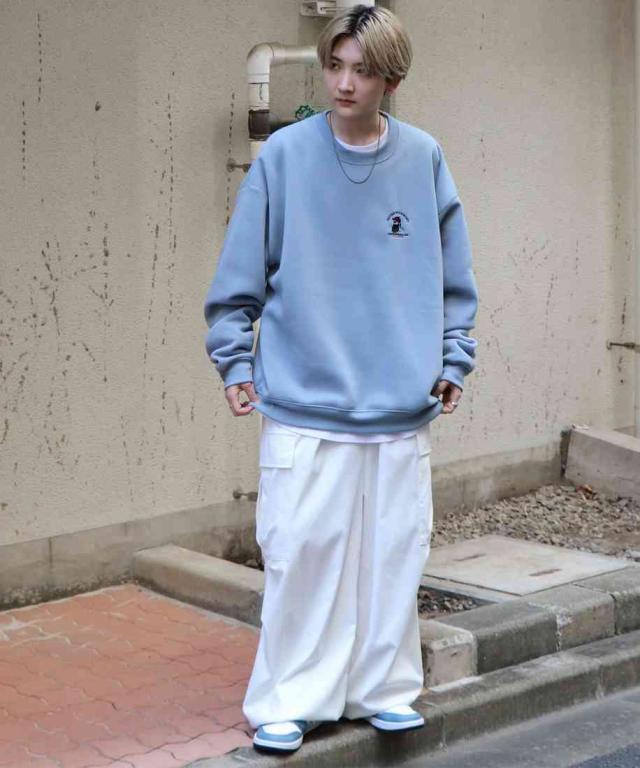 ボトムスはデニムパンツやパラシュートパンツ、カーゴパンツやナイロンパンツなどのアイテムを合わせたトレンドのカジュアルなコーディネート。