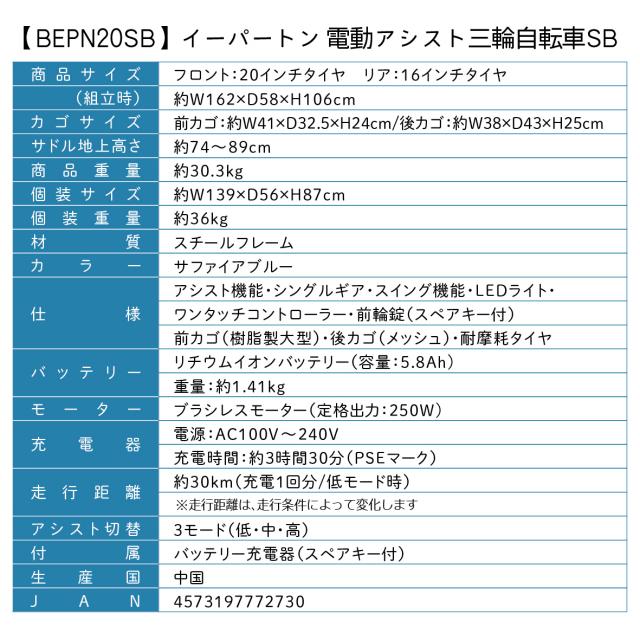 電動アシスト機能が付いた三輪自転車です。フレームカラーはサファイアブルー