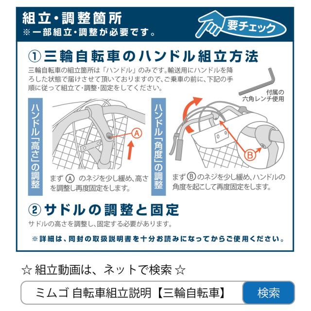 ・電動アシスト三輪自転車は、二輪自転車とは乗車感覚が全く違います。安全な場所にて十分練習してからご使用ください。