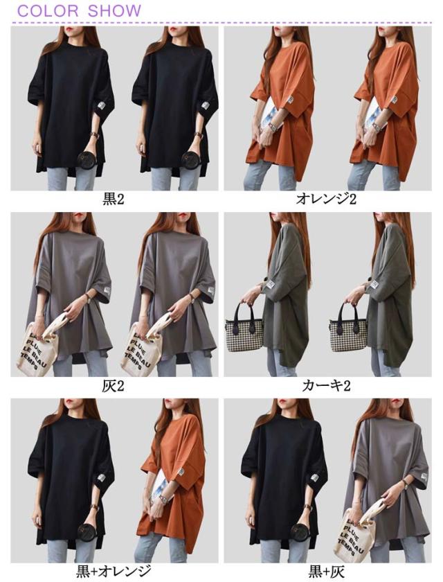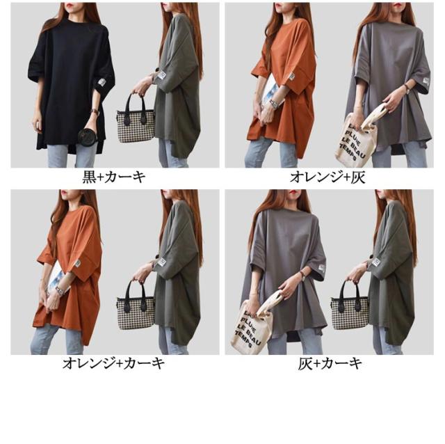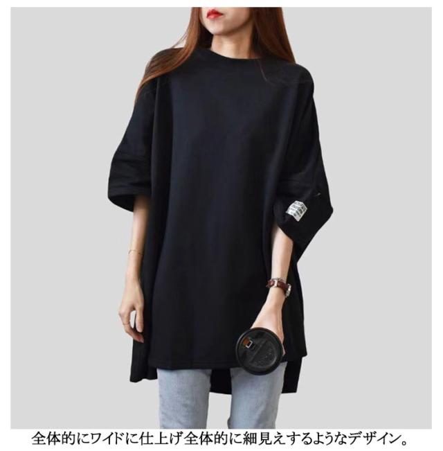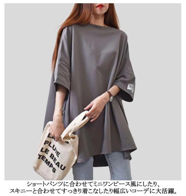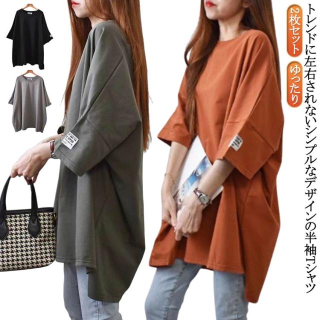 チュニック ゆったり 2枚セット ロング丈 お尻隠し レディース 無地 ビッグシルエット トップス カットソー 体型カバー 5分袖 ティシャツ ゆる ドロップショルダー ワイド 半袖ロングTシャツ 大人かわいい 大人可愛い おしゃれ マタニティ