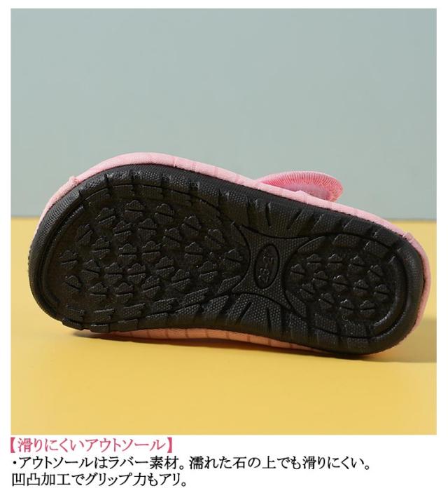 | 13cm〜27cm 【水遊びレジャーにピッタリ!】 ・川や海などの水遊びレジャーを楽しく♪「マリンシューズ キッズ」が新登場! 【水遊びを安全に】 ・川や海の底にある危険なものからお子さまの足をガード♪安全に水遊びを楽しめるアイテム。 【フィット感抜群】 ・屈曲性に優れたアウトソールと、柔らかインソールが足にフィット!脱げにくいのもポイント。 【滑りにくいアウトソール】 ・アウトソールはラバー素材。濡れた石の上でも滑りにくい。凹凸加工でグリップ力もアリ。 【陸上でも】 ・しっかりとした作りで陸上で履いても◎履いたまま水中に行けるから、脱ぎ履きの手間もナシ♪ 【着脱も簡単!】 ・履き口は、お子さま1人でも着脱がカンタンな面ファスナー式。 【お手入れ簡単、いつでも清潔】 ・インソールは取り外しができるので、手軽に水洗いができていつでも清潔。 【持ち運びに便利】 ・軽量で柔らかい素材でできているから、かさばらずコンパクト。旅行などの持ち運びにも便利! 【シンプルなデザイン】 ・柄がなく、水着にも合わせやすいかわいいカラー展開。水泳教室のプールサイド用にもピッタリ☆ | |