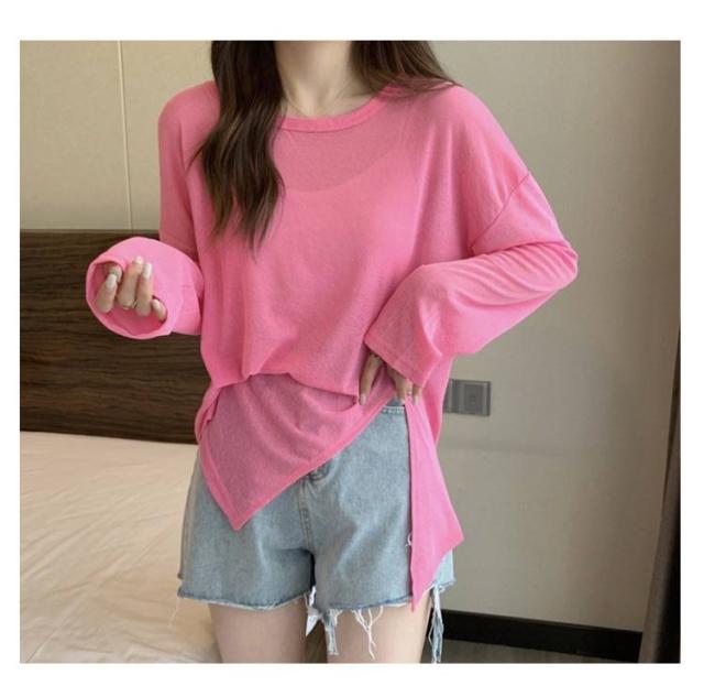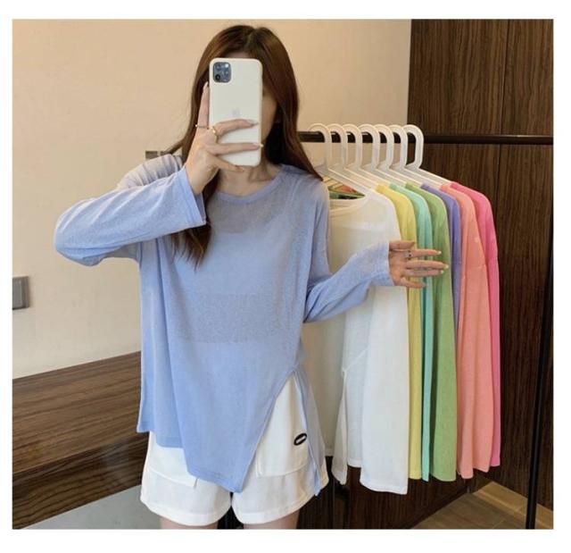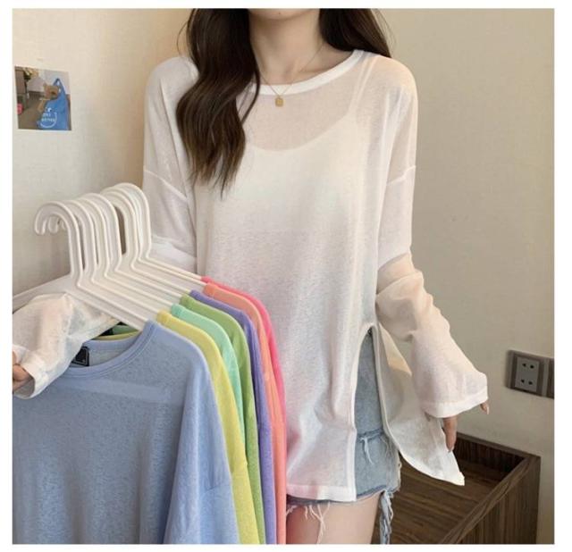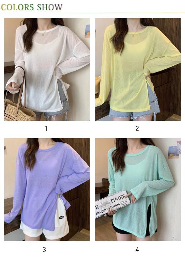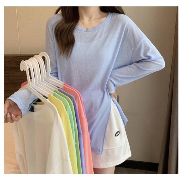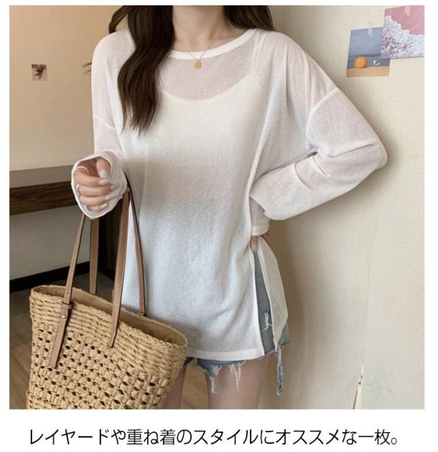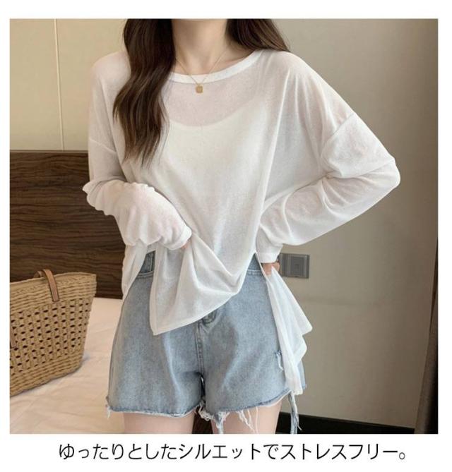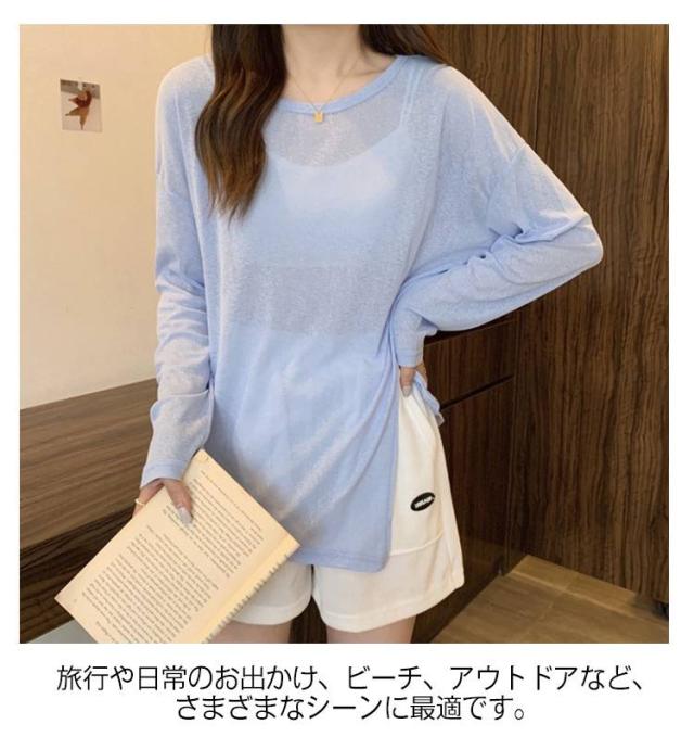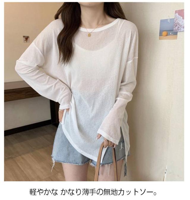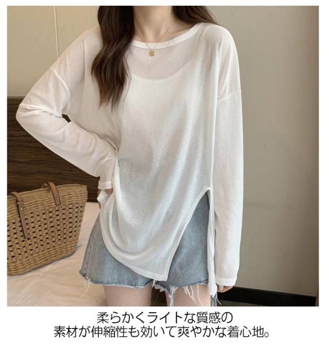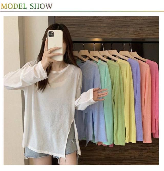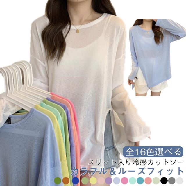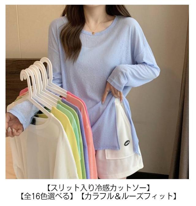 レディース 冷感 接触冷感 UVカットTシャツ 長袖tシャツ クール スリット シアートップス カットソー トップス 薄手 夏 春 クルーネック インナー uv 涼感 日よけ 無地カットソー 紫外線対策 重ね着 涼しい 大きサイズ 全15色