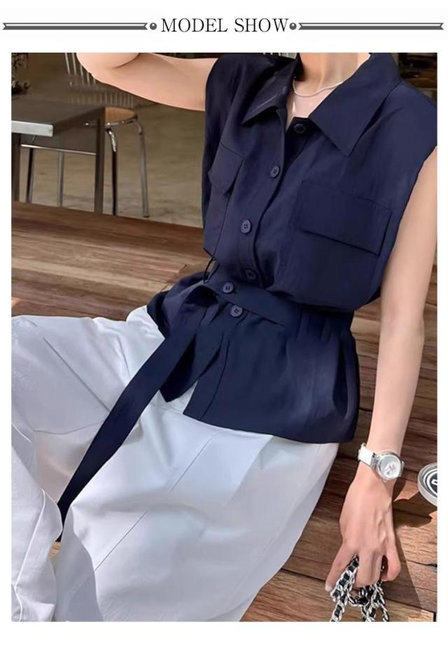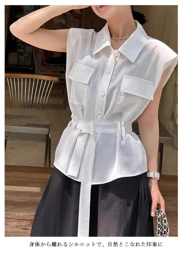 ノースリーブ ノースリーブブラウス ポケット付き レディース シャツブラウス ブラウス 大人可愛い ベスト 夏 薄手 袖なし ゆったり トップス 襟付き ベルト付き ブラウス 韓国 きれいめ おしゃれ 夏物 夏服 通学 通勤 オフィス カジュアル 紺 ネイビー 白