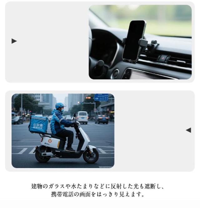 | 日差しの強い日に画面が見えなくなる現象を防ぐスマホ専用傘。 夏のお出かけ時の写真撮影などにも大活躍! 自転車/バイク/オートバイ用傘、スマホを太陽や雨から守ります! アウトドアで行う活動するときに、太陽に反射した光を防止できます。 建物のガラスや水たまりなどに反射した光も遮断し、携帯電話の画面をはっきり見えます。 | |