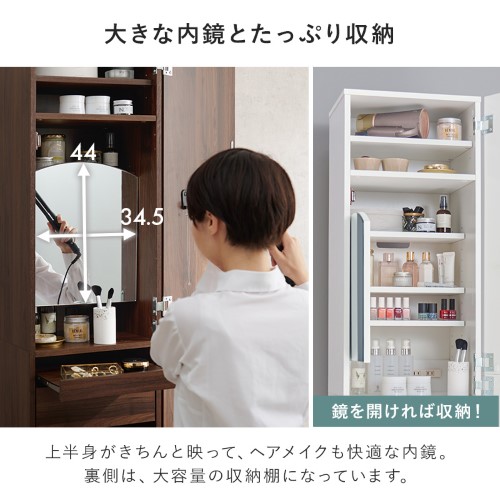 | 【商品紹介】 スペースを賢く使えるスリム設計。姿見を開けるとスツール付の大容量収納ドレッサーに。 |