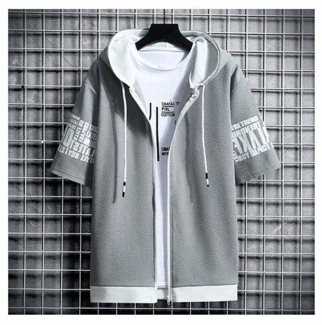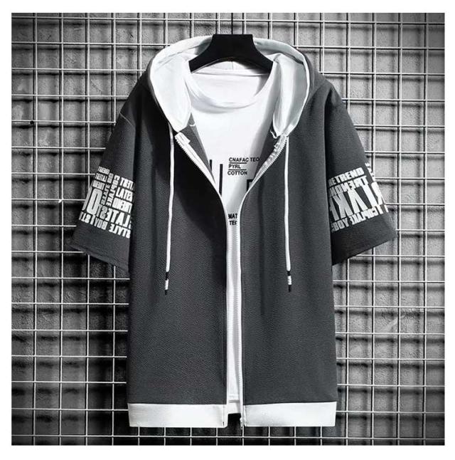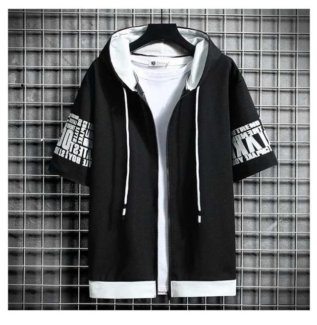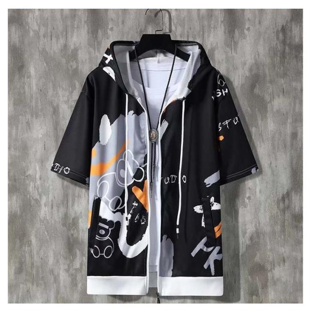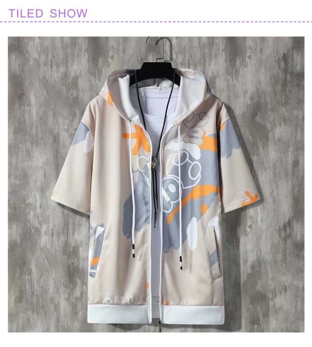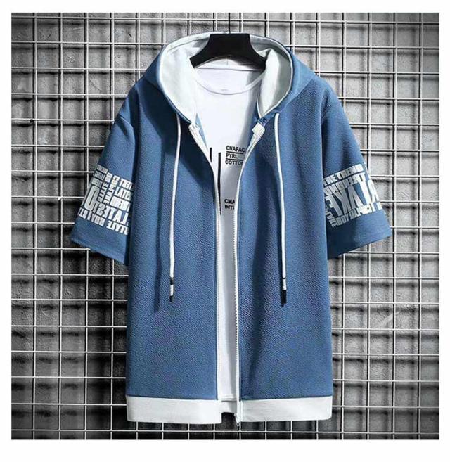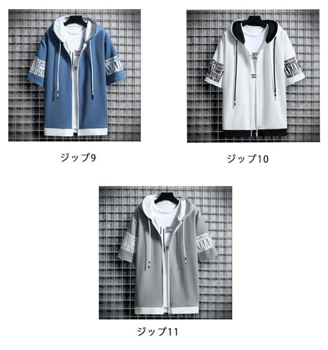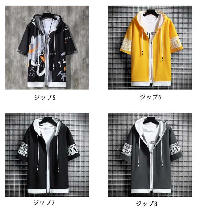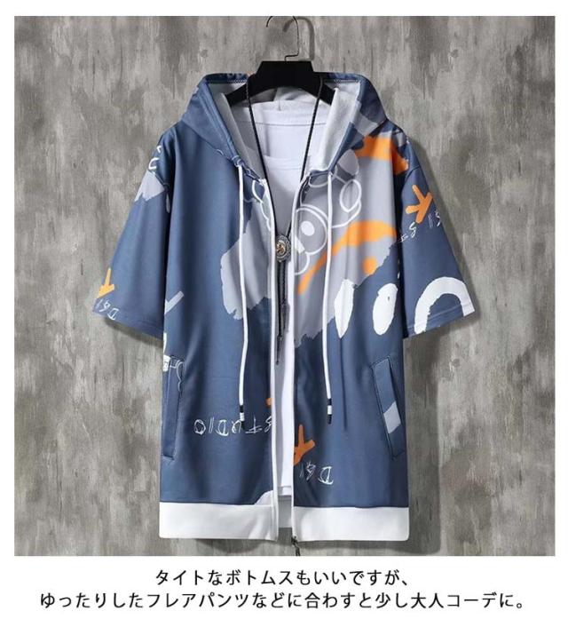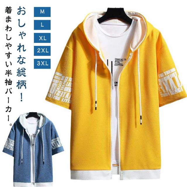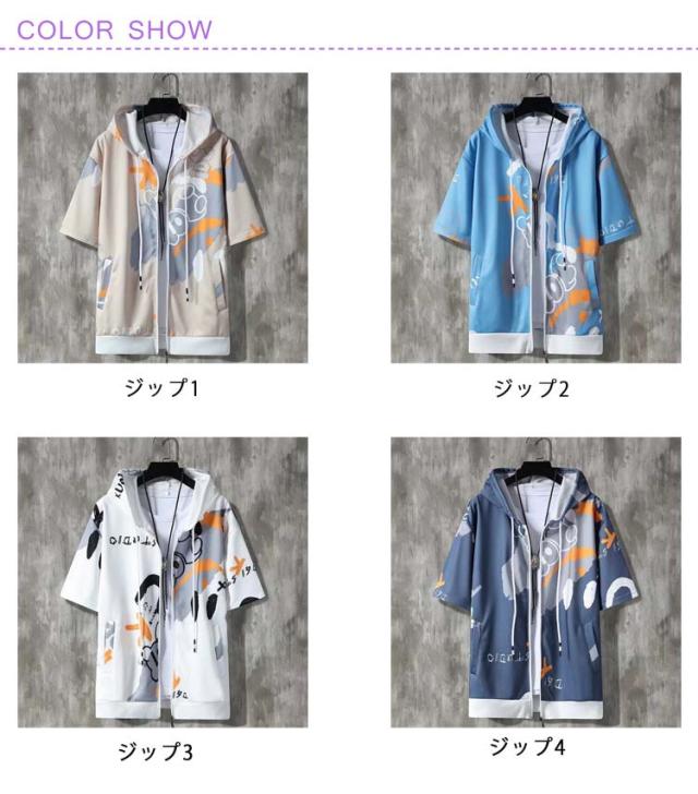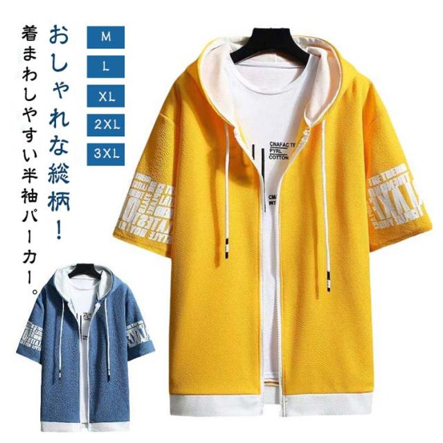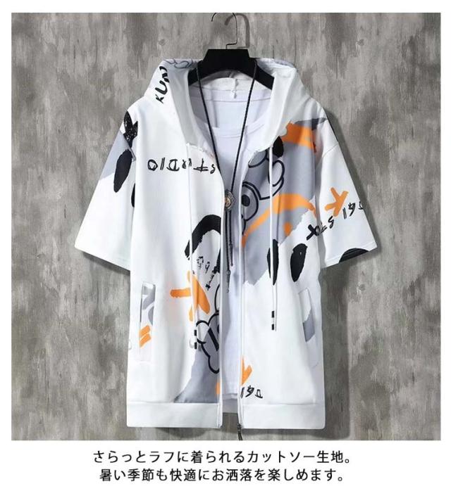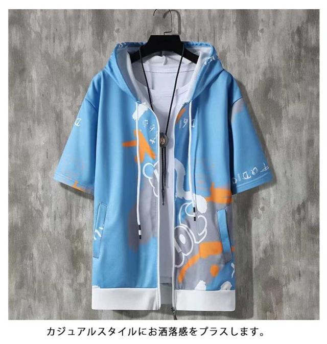 パーカー 半袖 ウェットパーカー メンズ トレーナー 送料無料 夏 フード付き プリント 送料無料 前開き トップス おしゃれ カジュアル 大きいサイズ 薄手 メンズファッション 韓国ファッション M L XL 2XL