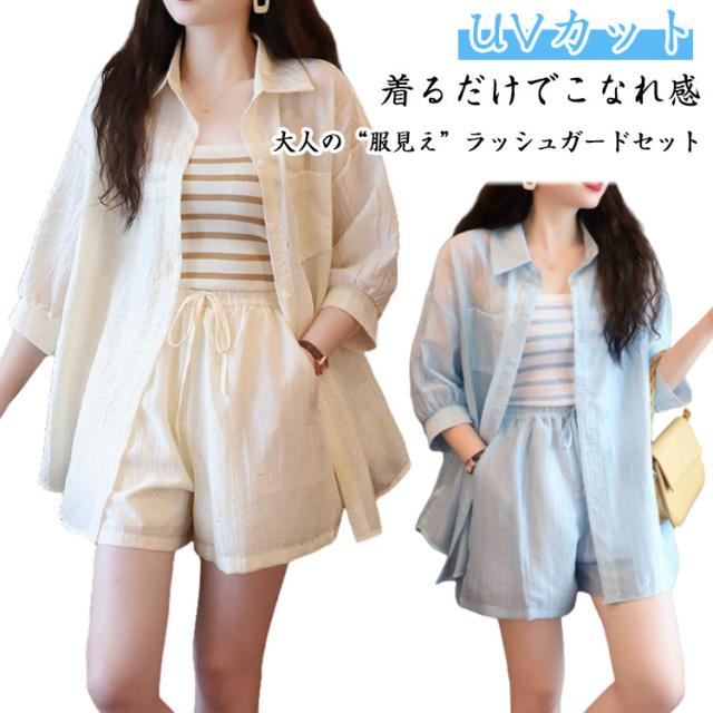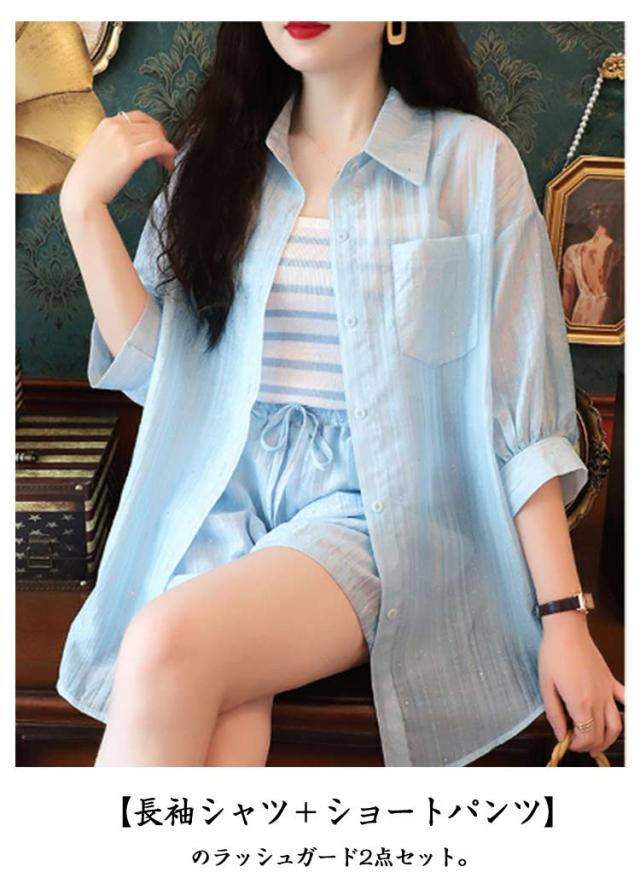 羽織り ラッシュガード トップス ラッシュガード シャツ UV対策 セットアップ UVカット ストライプ UVケア 日焼け防止 紫外線対策 オーバーシャツ 長袖 オーバーシャツ ママ水着 服見え 体型カバー お洒落