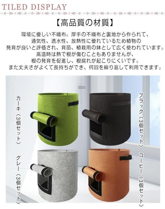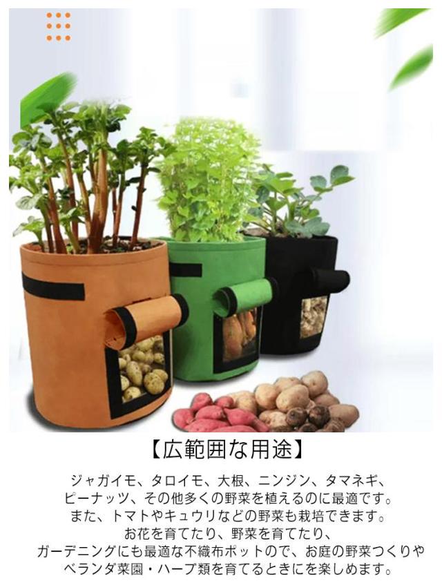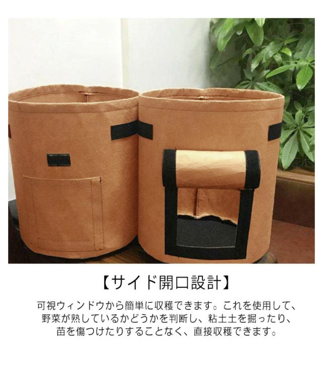 | 【高品質の材質】環境に優しい不織布。厚手の不織布と裏地から作られて、通気性、透水性、放熱性に優れているため植物の発育が良いと評価され、育苗、植栽用の鉢として広く使われています。高温時は熱で根が傷むこともありませんが、根の発育を促進し、根腐れが起こりにくいです。また丈夫さがよくて長持ちができ、何回を繰り返して利用できます。 【サイド開口設計】可視ウィンドウから簡単に収穫できます。これを使用して、野菜が熟しているかどうかを判断し、粘土土を掘ったり、苗を傷つけたりすることなく、直接収穫できます。 【室内栽培可能】軽量で持ち手が付いてるので移動が楽です。室内栽培可能,透水性と保水性がありますので底面に石を敷く必要なし。不織布が土の流出を防ぎ鉢底石いらずのポットなので、ベランダでの利用にも便利です。 【取っ手が付い】フェルトプランターは丈夫な取っ手が付いてあり、移動するときとても便利です。 【広範囲な用途】ジャガイモ、タロイモ、大根、ニンジン、タマネギ、ピーナッツ、その他多くの野菜を植えるのに最適です。また、トマトやキュウリなどの野菜も栽培できます。お花を育てたり、野菜を育てたり、ガーデニングにも最適な不織布ポットので、お庭の野菜つくりやベランダ菜園・ハーブ類を育てるときにを楽しめます。 | |