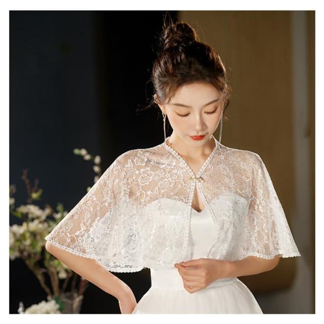 | レースショール 繊細なレースが華やかな印象を与える、ブライダル用薄手ボレロ。 【美しく引き立てるレースケープ】 繊細なレースで仕立てたショール風のケープデザイン。ウェディングドレスやパーティードレスにぴったりな一枚です。肩から腕を上品にカバーし、華やかさと気品をプラス。 【薄手で軽やか、春夏に最適】 薄くて通気性の良い素材を使用し、暑い季節でも快適に着用できます。透け感のあるレースがふんわりと肌を包み込み、涼しげで優雅な印象に。 【体型カバーにも◎】 気になる二の腕や肩回りを上品にカバーしてくれるデザインで、安心して着用可能。 | |