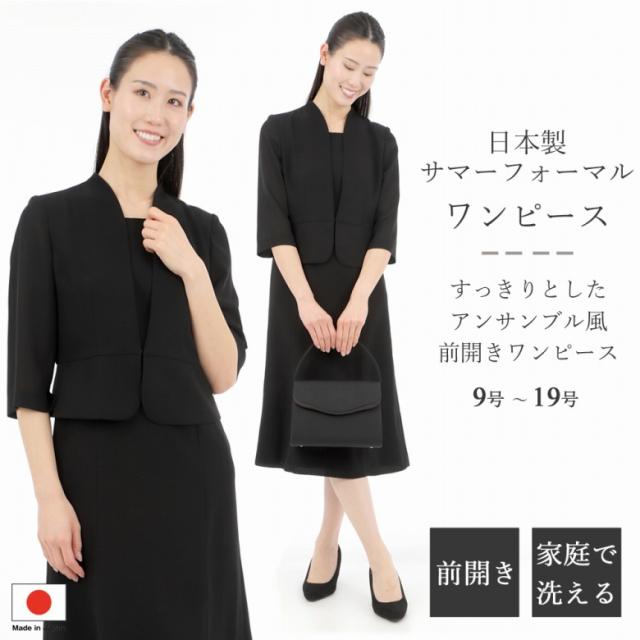 夏用 日本製 ブラックフォーマル ワンピース:FV14010 単品 お家で洗える アンサンブル風 国内縫製 大きいサイズ 弔事 慶事 婦人 礼服 喪服 日本製 黒 冠婚葬祭 葬儀 葬式 通夜 法事 法要 礼装 レディース